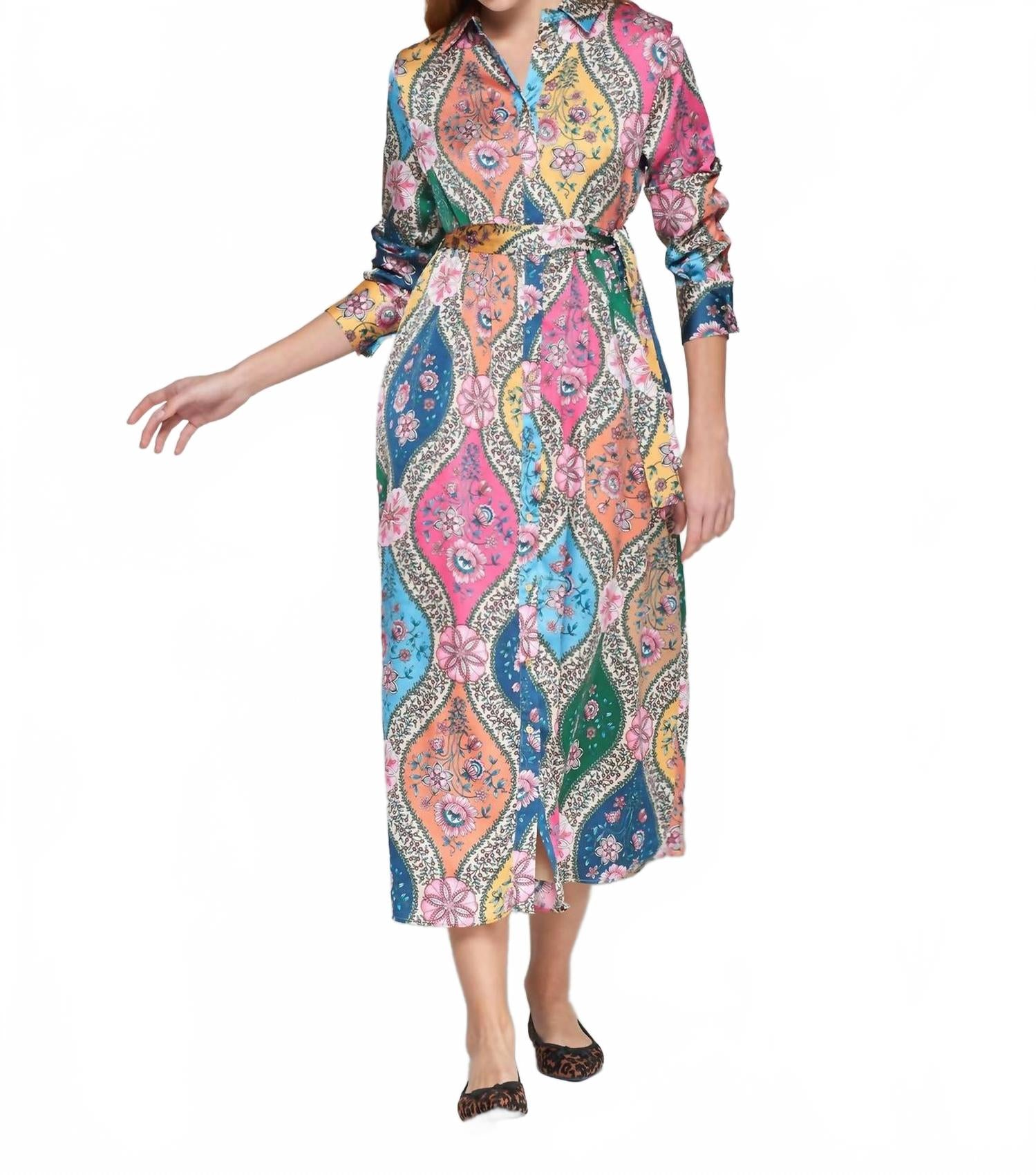 Комфортное и одновременно привлекательное платье, которое вы будете носить каждый сезон. Длинное платье-рубашка с разноцветным геометрическим цветочным принтом. Классический воротник, застежка на пуговицы спереди и длинные рукава. Пояс из ткани в тон на талии. Прямой крой.