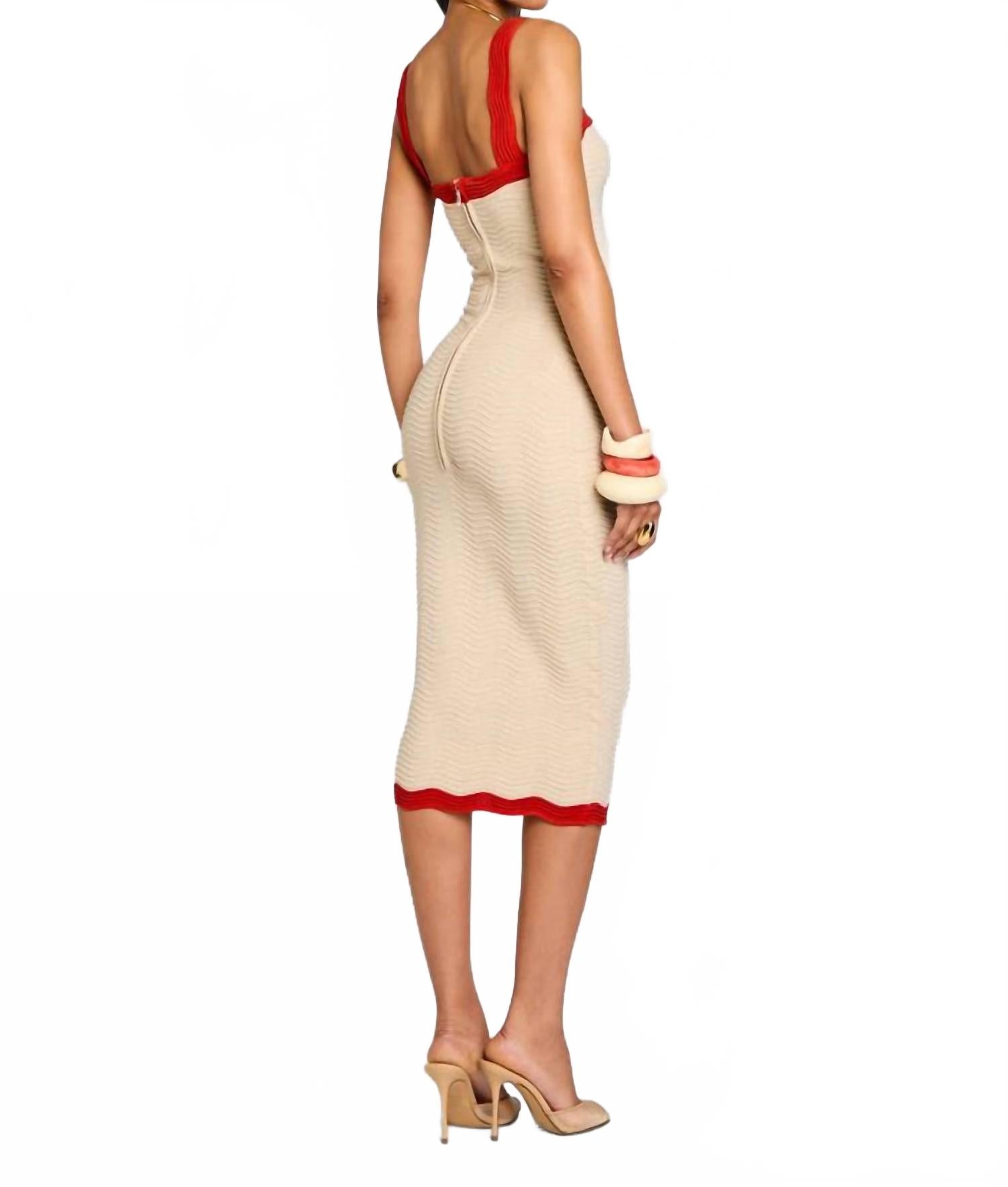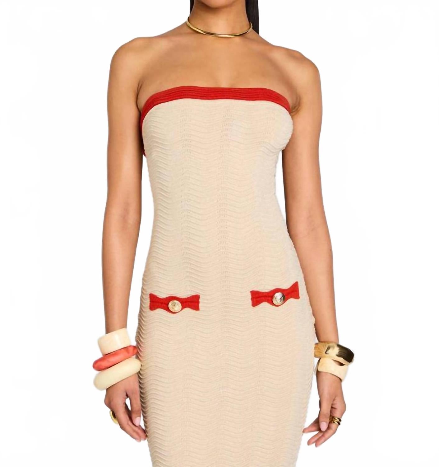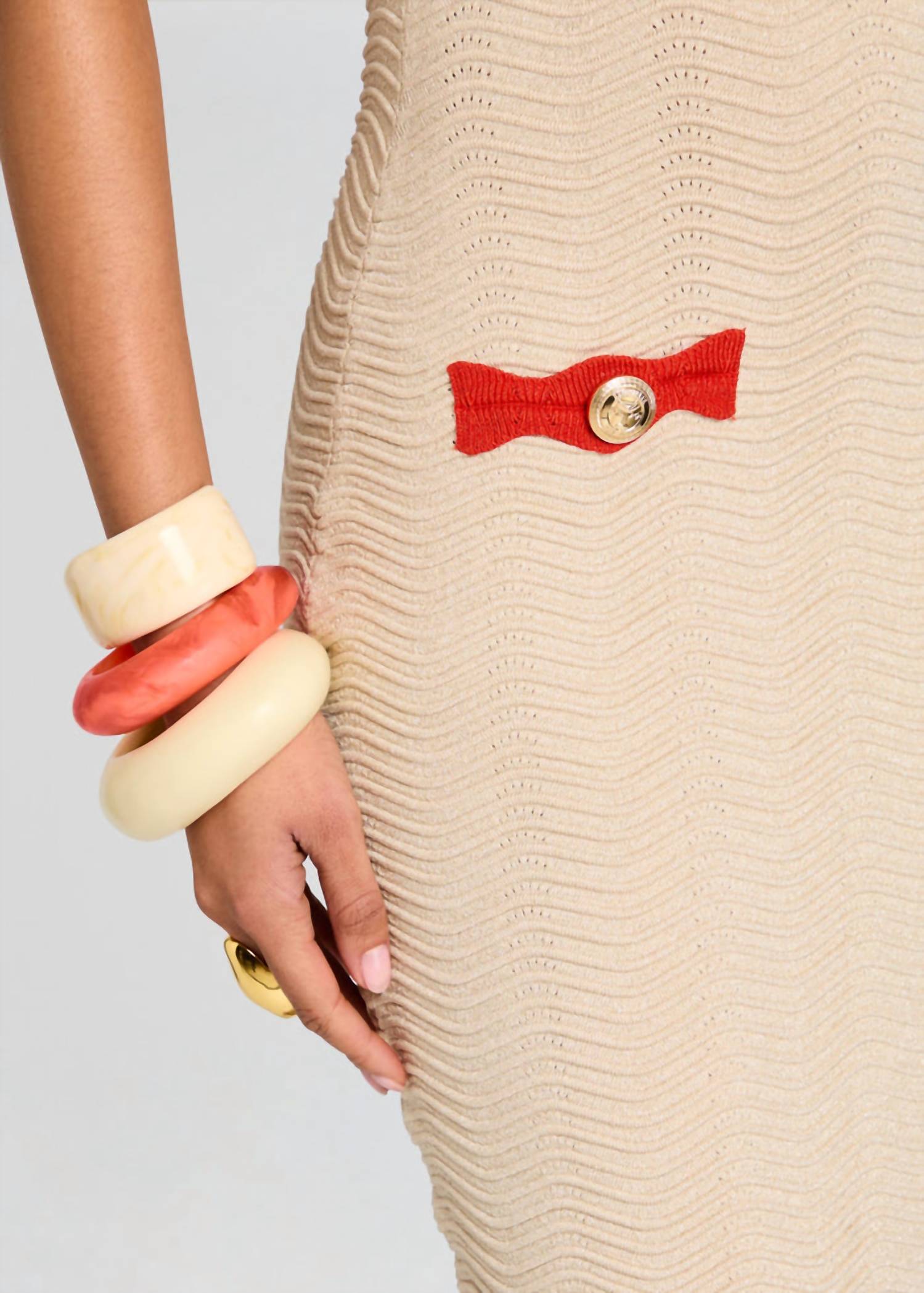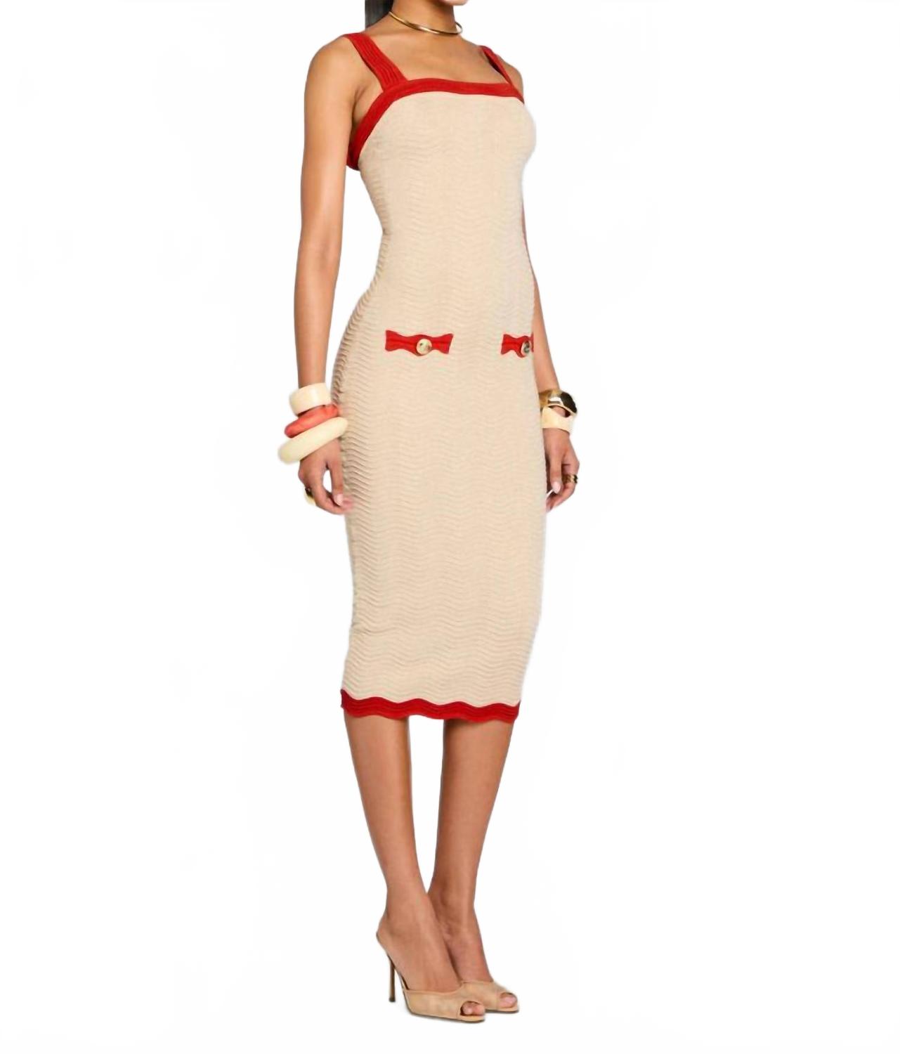 Подчеркните свой отпускной стиль с помощью трикотажного платья Kins Knit Dress от RETROFETE, представленного здесь в цвете «металлик/герань». Это платье миди длиной 38 дюймов (размер S) выполнено из роскошного трикотажа, состоящего из 60% вискозы, 32% нейлона, 5% металлик и 3% спандекса, что обеспечивает облегающий силуэт. Платье оснащено съемными бретелями и безбретельками, а также надежной застежкой-молнией для дополнительного комфорта. Платье, произведенное в Китае, сочетает в себе изысканность и практичность и идеально подходит для любого шикарного отдыха. Рост модели - 178 см, размер S.