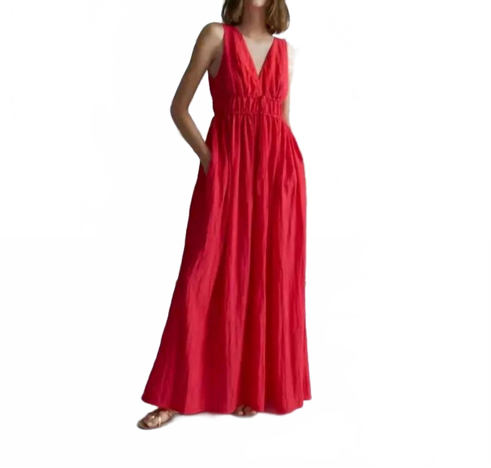 Идеальное сочетание классической элегантности и современного стиля. Платье макси без рукавов с V-образным вырезом и А-силуэтом, подчеркивающим фигуру. Функциональные карманы и едва заметная двойная сборка на талии для дополнительной структуры. Застежка-молния. Только химчистка. Идеально подходит для романтических встреч, это платье станет прекрасным выбором для Дня святого Валентина или любого элегантного вечернего мероприятия.