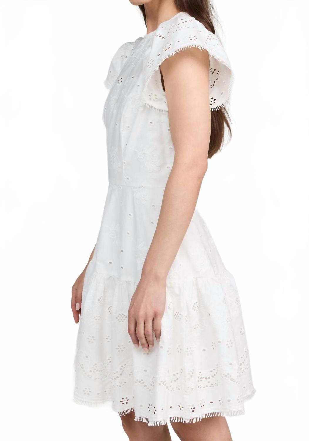 Платье, которое вы будете носить круглый год. Ощутите непреходящую элегантность в платье Hudson от Shoshanna, идеально дополняющем ваш летний гардероб. Это мини-платье цвета optic white с короткими рукавами и А-силуэтом выполнено из 100% хлопковой ткани с люверсами. Платье изготовлено в Индии. Юбка многоярусная, с отделкой из реснитчатой ткани, круглый вырез горловины добавляет ему очарования. Застежка: крючок и потайная молния сзади. Уход: только химчистка. Размер указан для размера 4, длина изделия 35,75 дюйма.