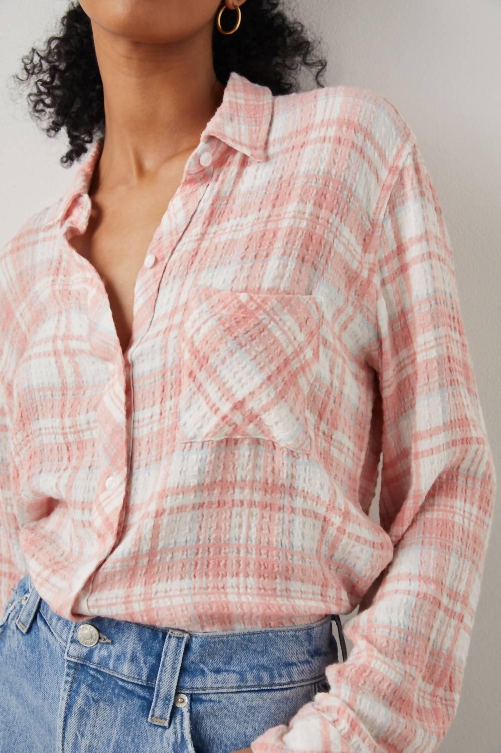Представляем рубашку Brady от Rails - шикарное дополнение к вашему гардеробу с изысканным клетчатым узором White Peach Cloud. Эта рубашка на пуговицах с длинными рукавами изготовлена из мягкого шелка (66% вискозы, 31% полиэстера, 3% спандекса) длиной 26,375 дюйма. Благодаря классическому воротнику и практичным карманам она идеально подходит для весенних мероприятий в стиле преппи или стильной праздничной вечеринки. Уход: ручная стирка и сушка на горизонтальной поверхности - так она сохранит свой первоначальный вид.