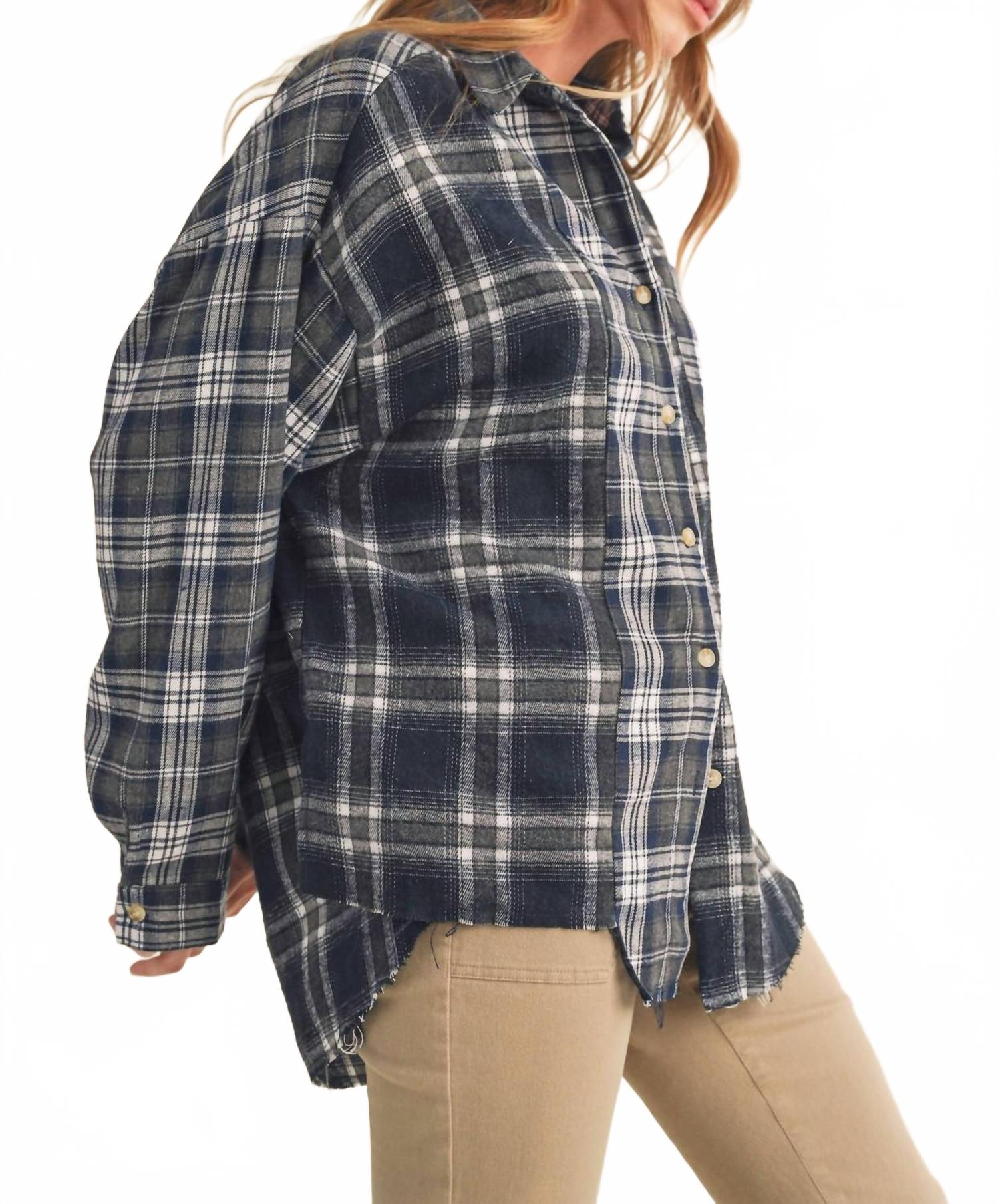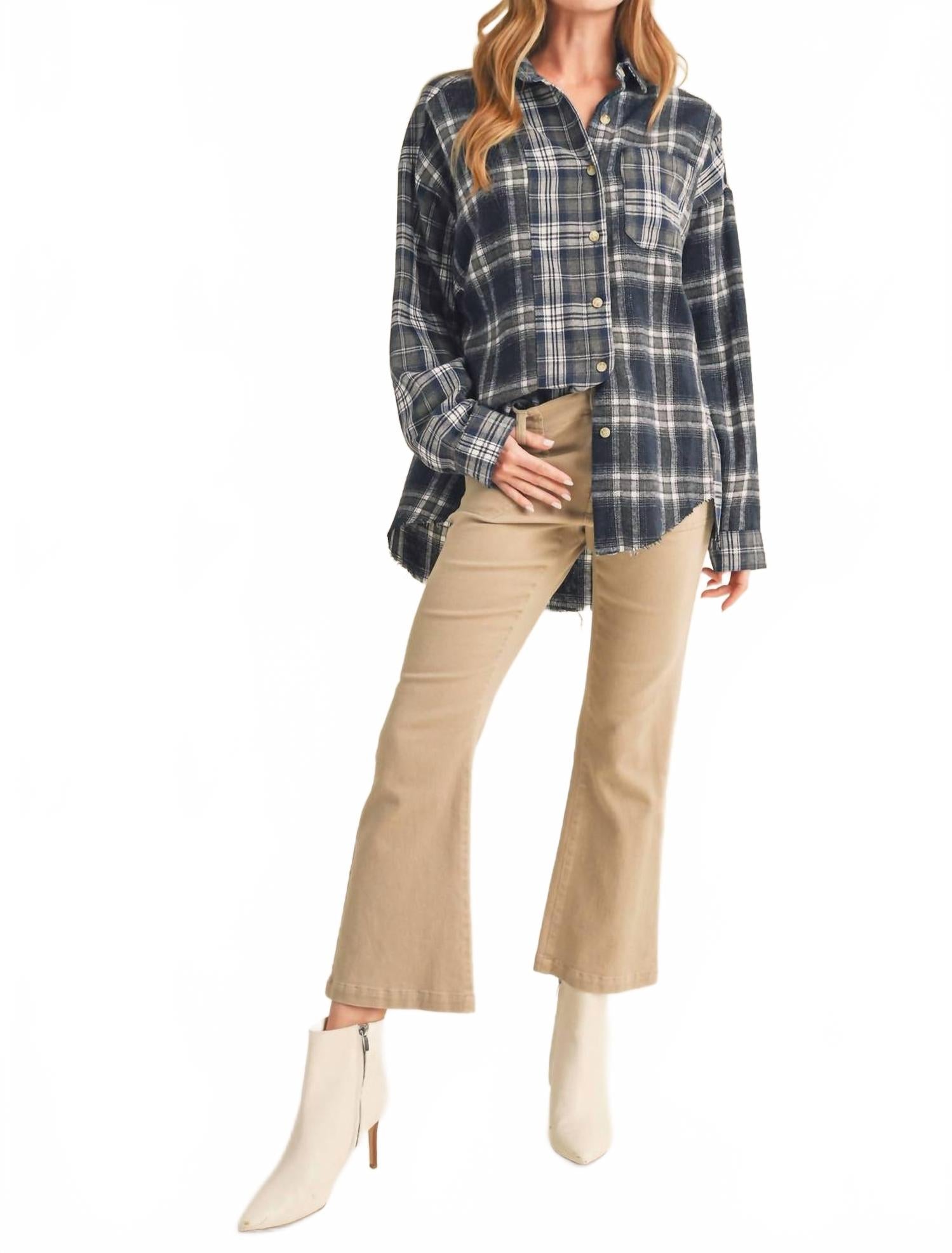 Эта рубашка на пуговицах удобная и в то же время элегантная. Представляем фланелевую рубашку Noelle от AEMI + CO - уникальное обновление классической свободной фланели с комбинированным кроем и лоскутным узором. Эта модель в клетку темно-синего цвета отличается длинными рукавами и удобным, слегка свободным кроем, создающим уютную атмосферу. Изготовлена ​​из хлопковой смеси (30% хлопка и 70% полиэстера), застегивается на пуговицы и имеет карманы для практичности. Уход прост: можно стирать в стиральной машине и сушить в стиральной машине.