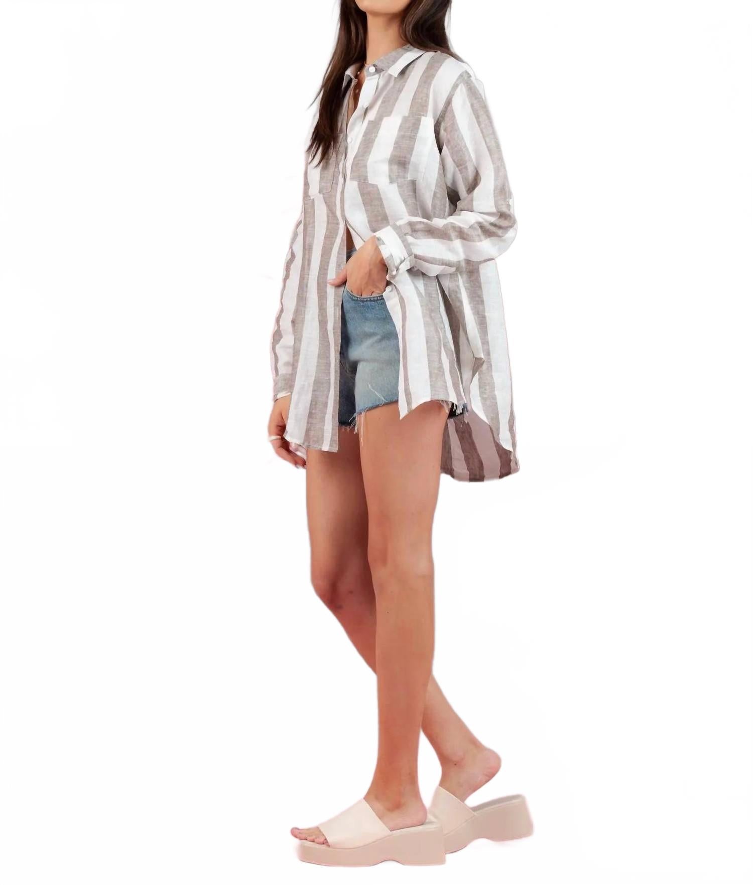 Классическая рубашка на пуговицах, которая никогда не выйдет из моды. Дополните свой гардероб полосатой рубашкой Drew Striped Button Down Shirt от LUCCA, которая идеально подходит для любого сезона. Эта женская рубашка с длинными рукавами кокосового оттенка отличается классическим воротником и удобными карманами. Модель с полосатым узором имеет свободный крой, идеально подходящий для отпуска или пасхальных торжеств. Застежка: пуговицы.