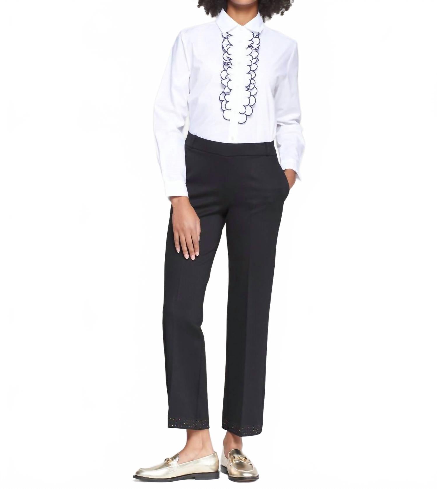 Эта рубашка на пуговицах удобная и в то же время элегантная. Дополните свой деловой гардероб рубашкой Vilagallo на пуговицах, выполненной в классическом белом цвете. Длинные рукава и изысканная черная оборка с фестончатым узором по центру придают классическому силуэту современный вид. Застежка: пуговицы. Создана для взыскательной женщины, которая ценит элегантность и функциональность.