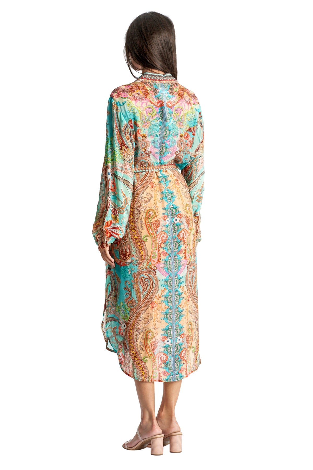 Это короткое платье с длинными струящимися рукавами, подчеркивающим фигуру силуэтом и украшениями сделает вас готовой ко всему.