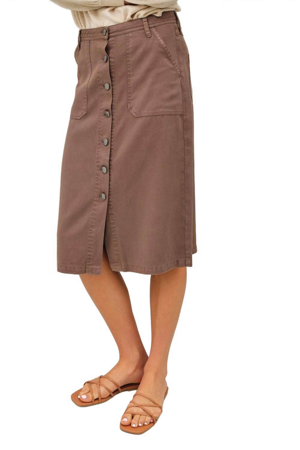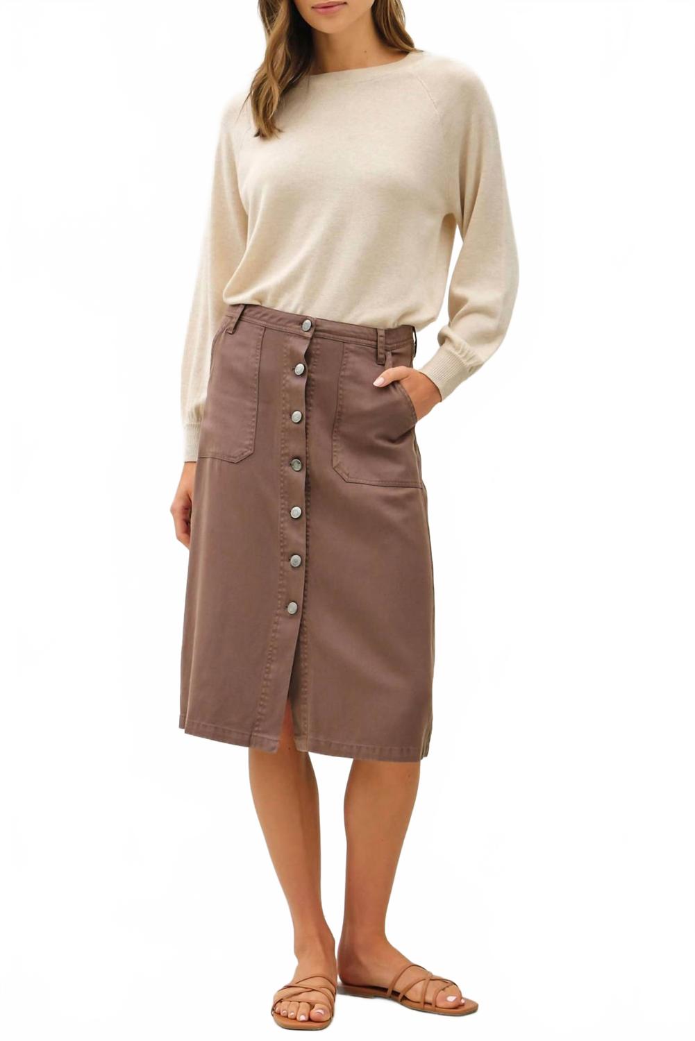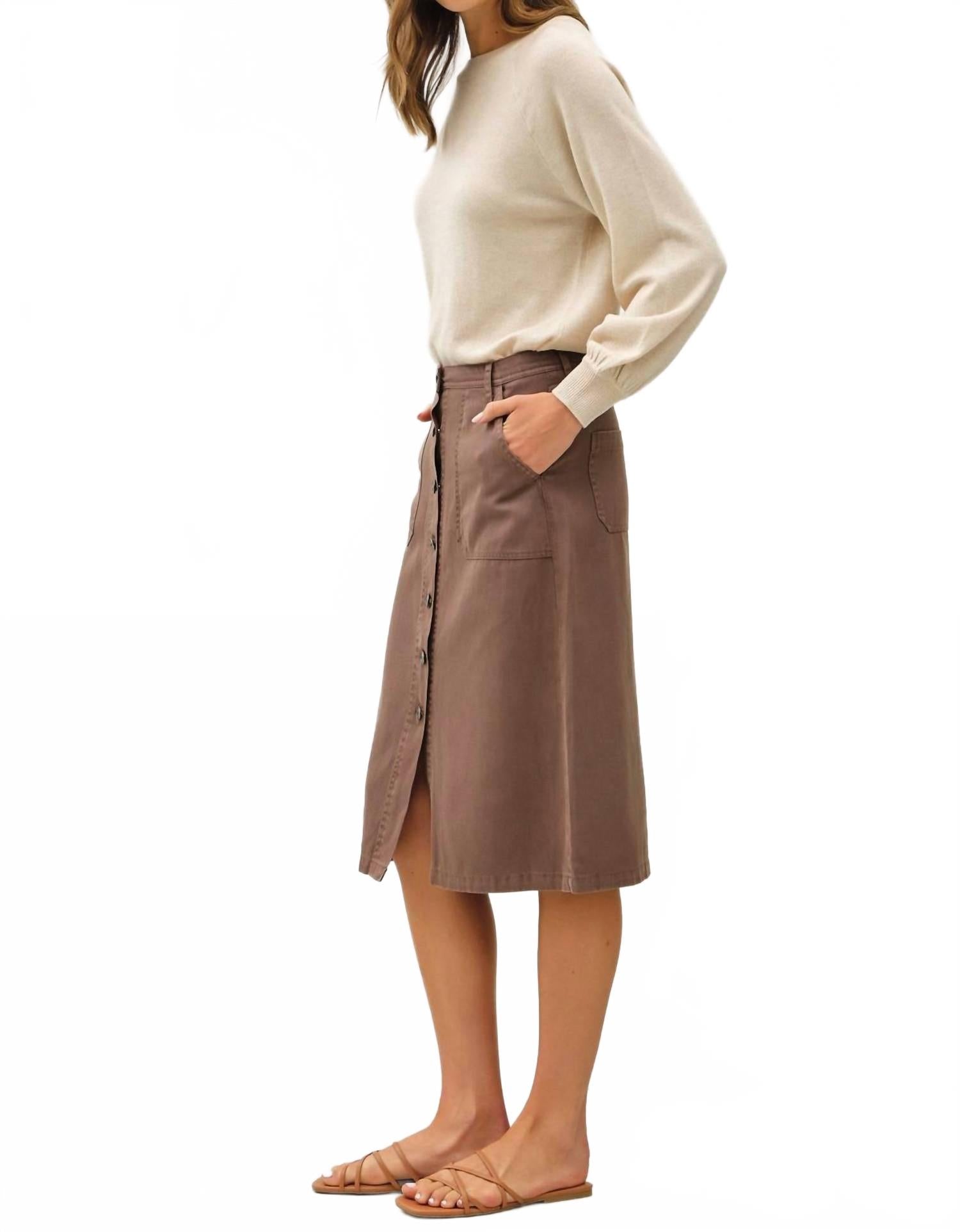 Покажите все, что нужно вашей коже, в этой изысканной юбке длины миди. Юбка застегивается на пуговицы спереди, имеет классический силуэт и панельный дизайн с эффектом стирки. Юбка изготовлена ​​из 69% тенселя, 23% хлопка и 8% льна.