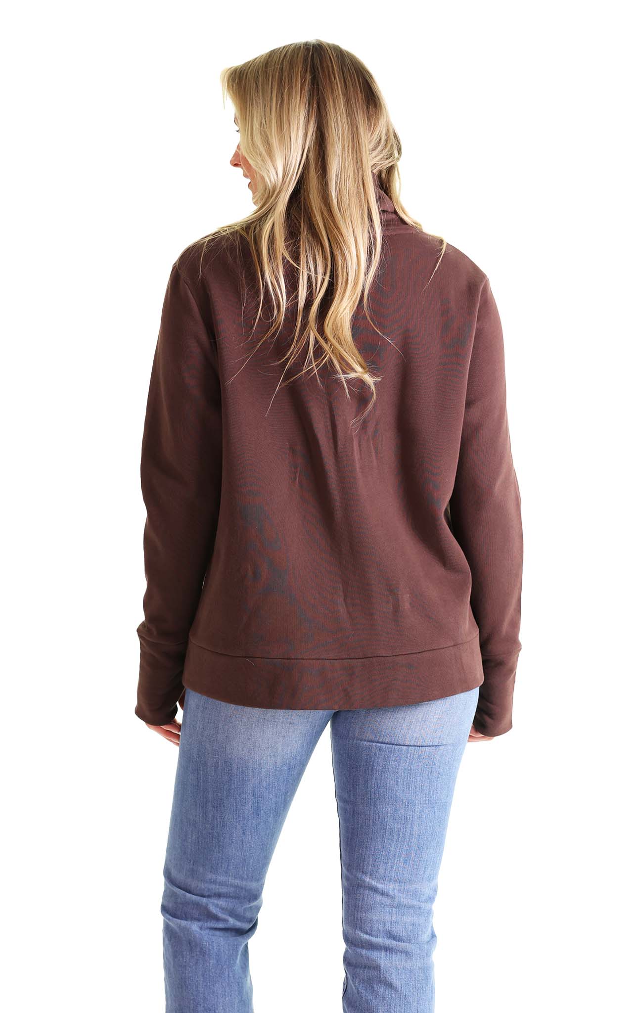 Детали - Шоколадный свитер с воротником-хомутиком, золотистые молнии по бокам, отверстия для больших пальцев