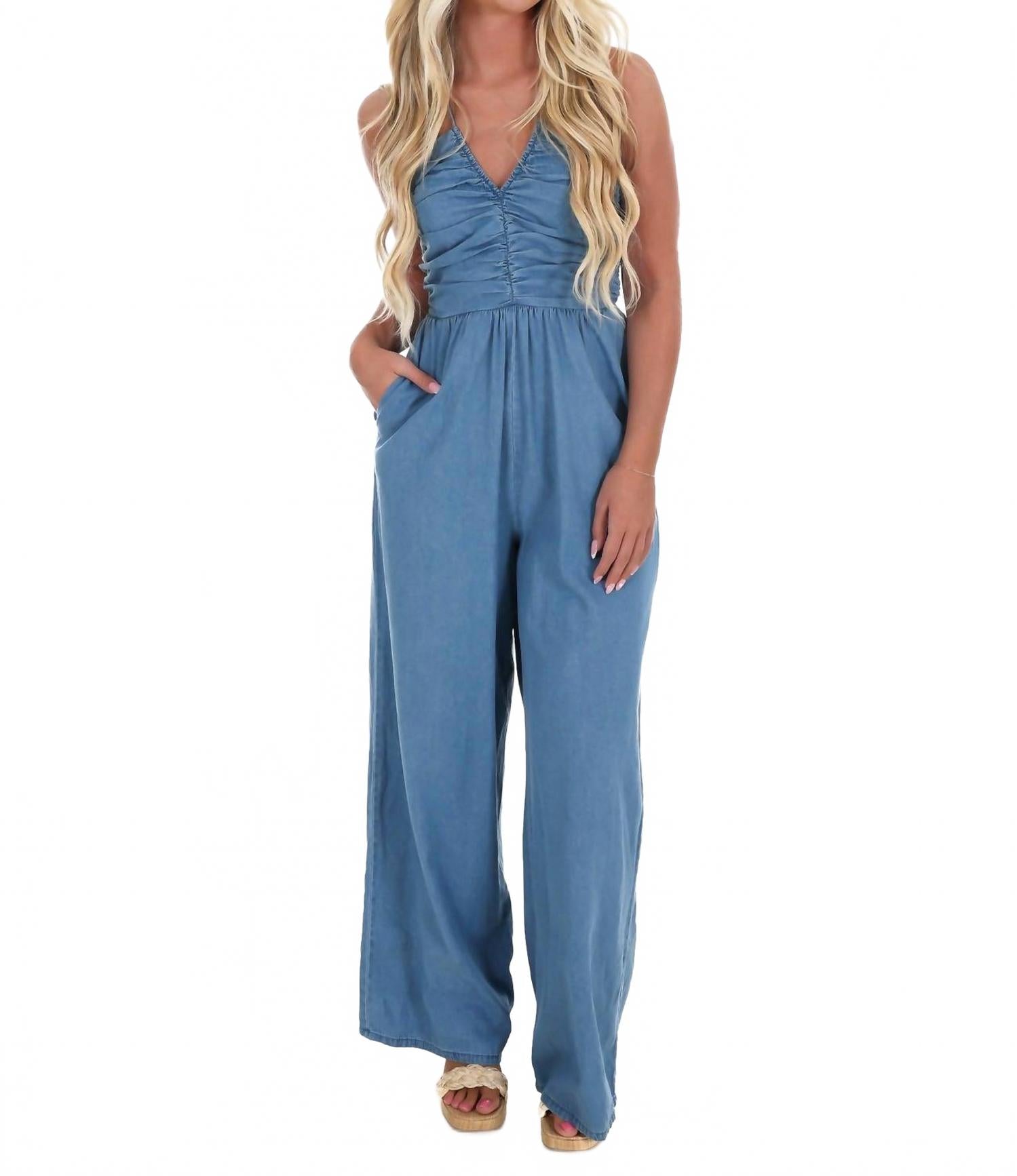Идеальный выбор, когда нужно быстро надеть что-то, но при этом выглядеть стильно и беззаботно. Представляем комбинезон Take Time Off Halter от Day + Moon - идеальное сочетание стиля и комфорта в джинсовой ткани средней плотности. Этот комбинезон с эффектным халтером и V-образным вырезом отличается однотонным рисунком и широкими штанинами для непринужденной посадки. Удобные карманы и завязка позволяют без труда сочетать функциональность и моду. Идеально подходит для осени и таких случаев, как начало учебного года или День благодарения.