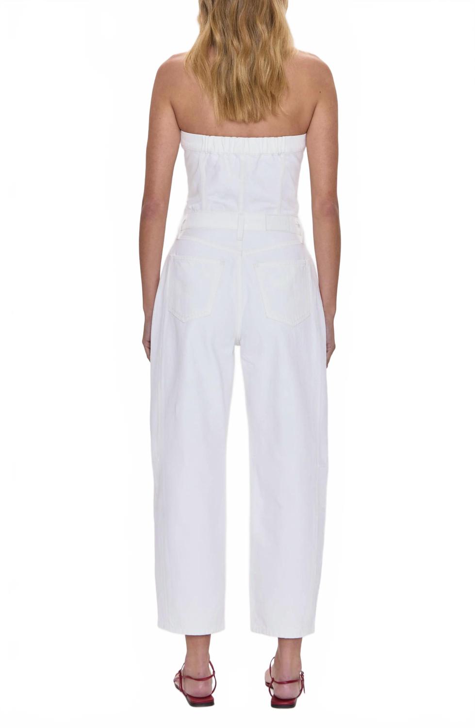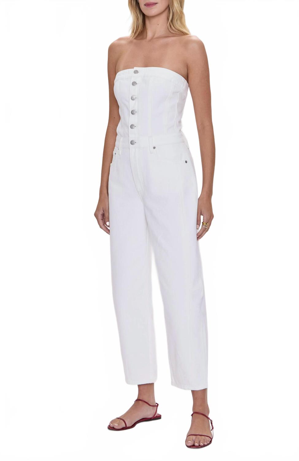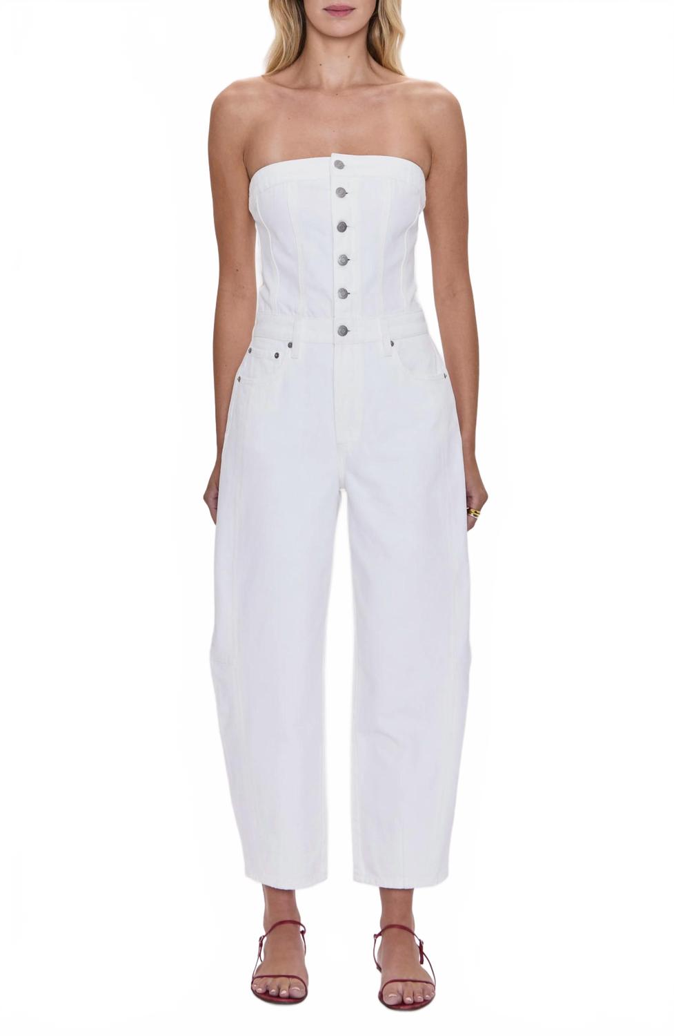 Примерьте комбинезон Daphne от Sundays в стиле 90-х - без бретелек, из неэластичного денима насыщенного белого цвета, с элегантным силуэтом, открывающим плечи. Этот комбинезон из 100% хлопка застегивается на пуговицы спереди и имеет свободный крой с прямыми брючинами-бочонками. Модель с пятью карманами, но без карманов. Длина внутреннего шва 26,5 дюймов (71 см) - воплощение современного стиля. Ухаживайте за комбинезоном: стирайте его в стиральной машине и сушите на горизонтальной поверхности - он идеально подходит для летнего ужина или празднования Дня независимости.