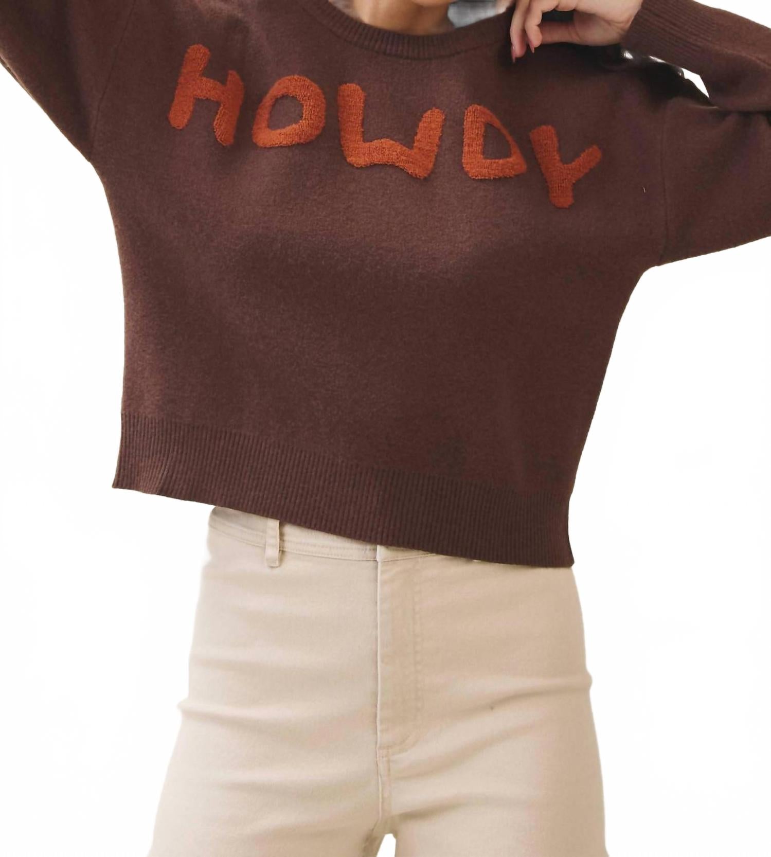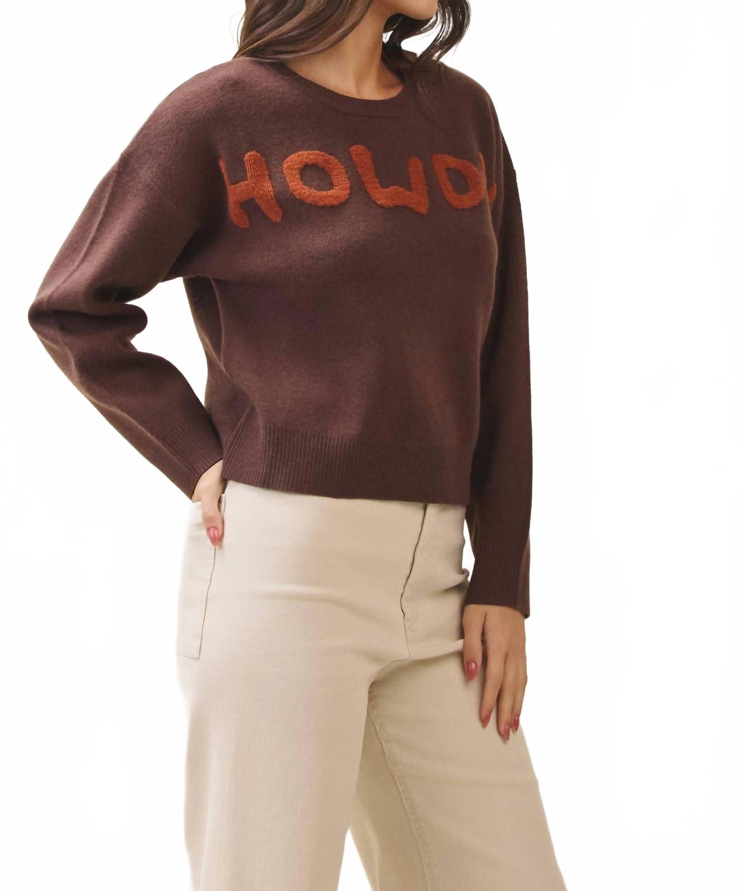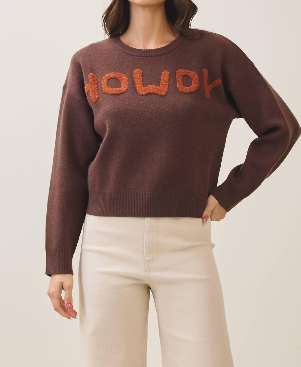 Ощутите идеальное сочетание комфорта и стиля в этом модном свитере с круглым вырезом, который легко добавит изюминку вашему гардеробу. Сочетайте его с любимыми джинсами и лоферами для создания идеального образа. Представляем свитер ABLE Howdy - уютное и игривое дополнение к вашему осеннему гардеробу в теплом коричневом оттенке. Этот женский свитер с длинными рукавами выполнен из текстурированного вискозного шелка с круглым вырезом, свободным, слегка укороченным силуэтом и спущенным плечом. Вышитая шенилловая надпись «Howdy» спереди делает эту модель в стиле вестерн современным воплощением минималистичного стиля. Этот свитер, вдохновленный стремлением к комфорту и изысканности, легко надевается и лучше всего стирать в стиральной машине и сушить на горизонтальной поверхности.
