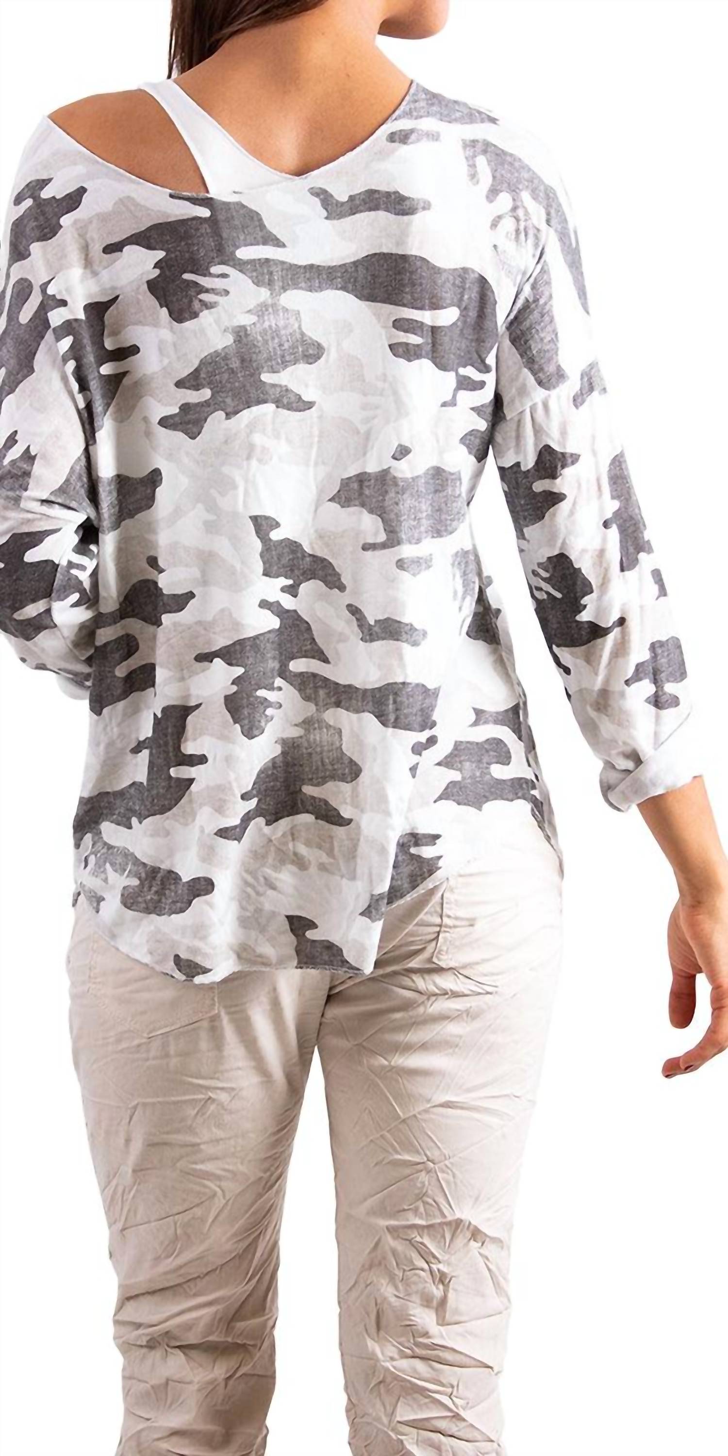 Ощутите идеальное сочетание комфорта и стиля в этом модном свитере с круглым вырезом, который легко дополнит ваш гардероб. Сочетайте его с любимыми джинсами и лоферами для создания идеального образа. Свитер Vittoria Camo от GIGI MODA, изготовленный из роскошной вискозной ткани, излучает изысканность благодаря эффектному камуфляжному узору. Этот стильный и комфортный свитер с вырезом-лодочкой и длинными рукавами украшен серебристой отделкой по подолу. Сделано в Италии, застегивается на пуловер и подходит для большинства размеров, что делает его идеальным осенним аксессуаром для путешествий или празднования Дня благодарения. Уход прост: ручная стирка и сушка на веревке для сохранения идеального состояния.