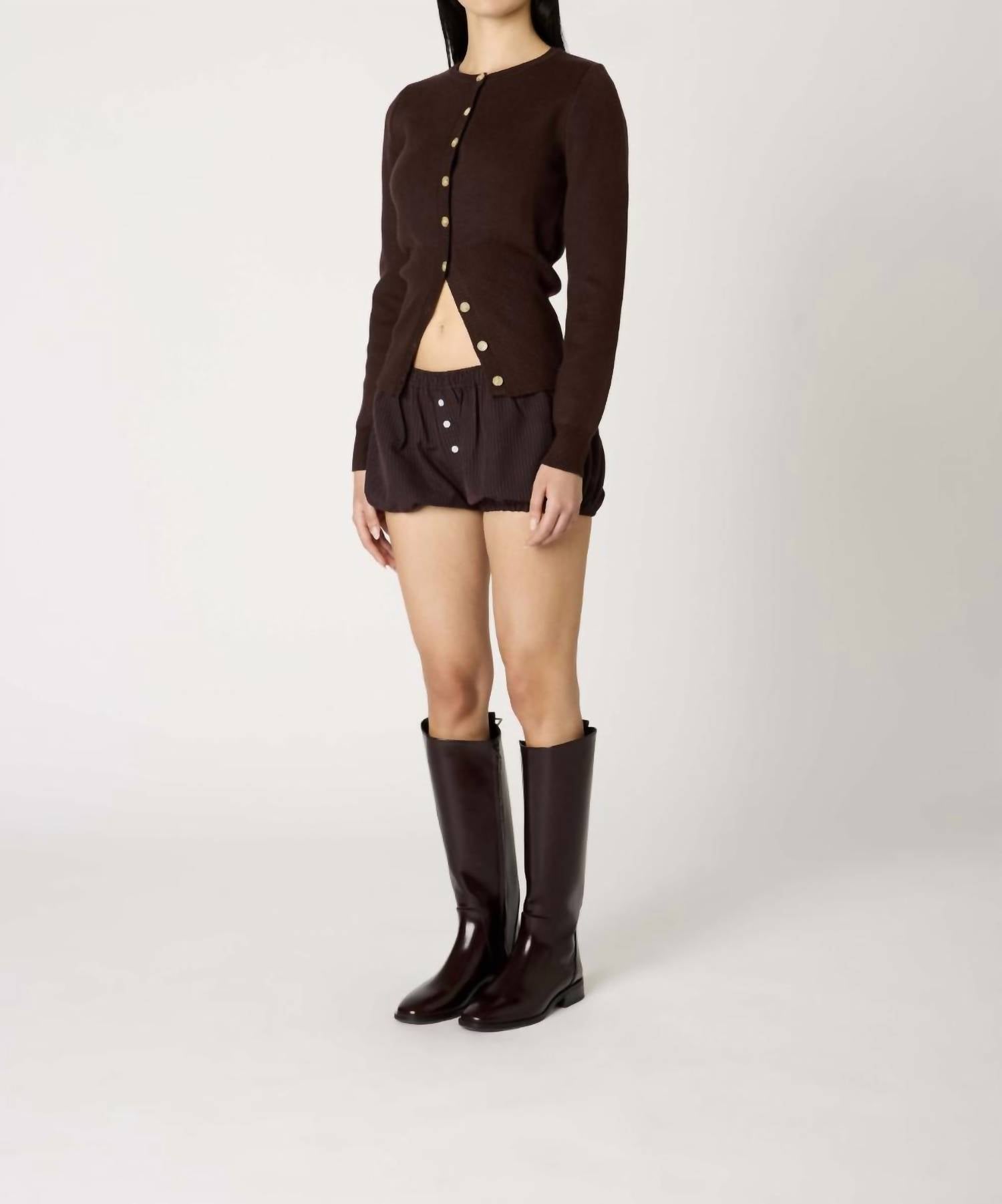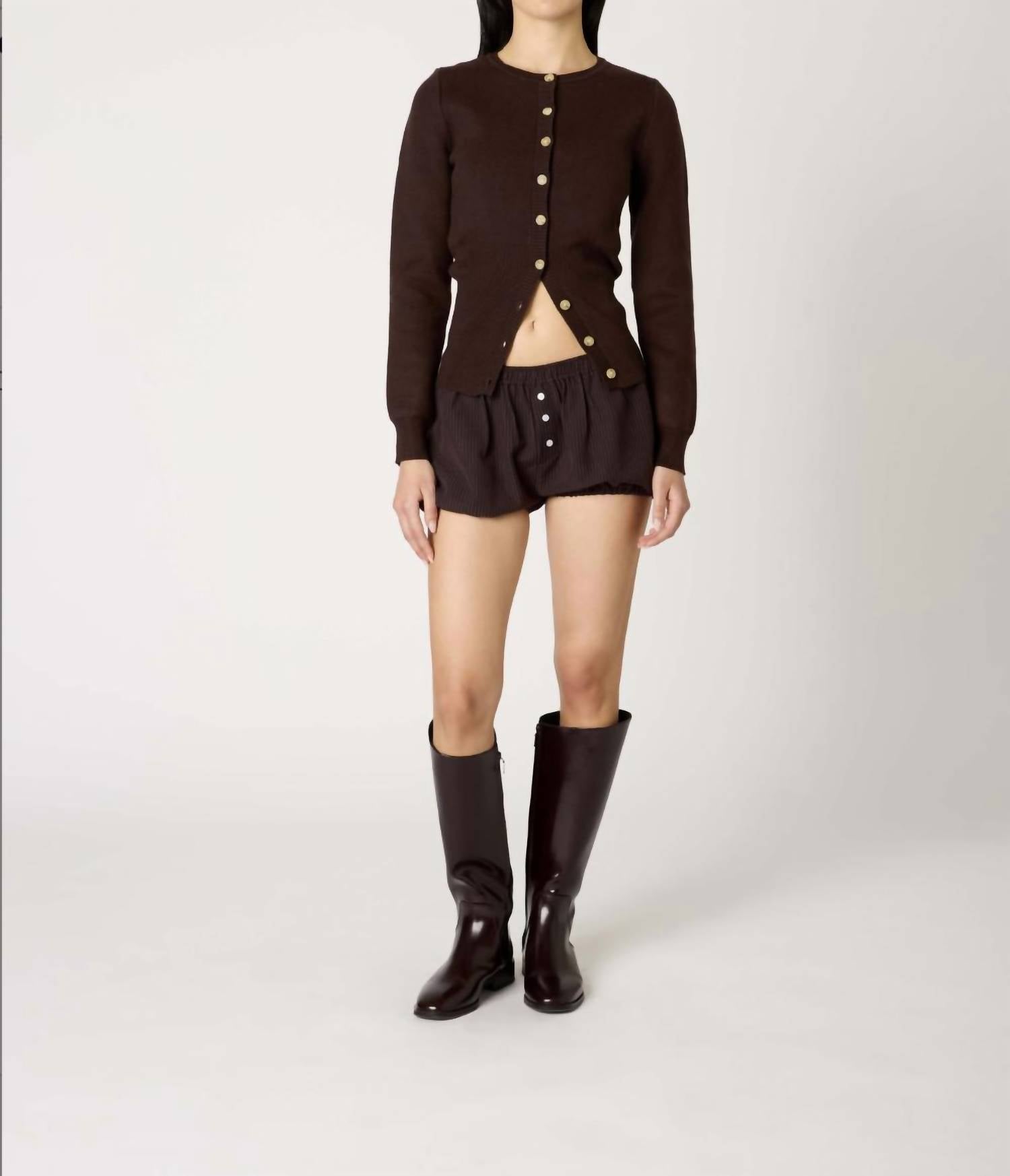 Кардиган NIA Sophia насыщенного кофейного цвета добавит винтажного очарования вашему осеннему гардеробу благодаря укороченному приталенному силуэту и ребристым манжетам и талии. Длинные рукава и застежка на пуговицы спереди подчеркивают стиль преппи и делают этот кардиган идеальным вариантом для многослойной одежды во время праздничных вечеринок. Состав: 27,7% полиэстер, 49,3% вискоза, 23% нейлон. Этот однотонный кардиган с круглым вырезом и мягким трикотажным полотном создаст изысканный образ. На модели размер S. Параметры модели: обхват груди: 32 дюйма, обхват талии: 24 дюйма, обхват бедер: 36 дюймов, рост: 175 см.