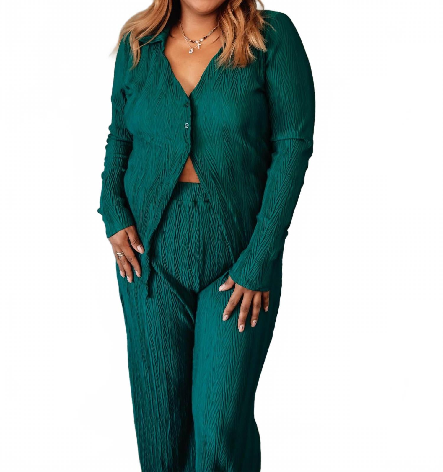 Откройте для себя комплект Emerald Ease Curvy Set от Curve Market - стильное и непринужденное дополнение к вашему гардеробу в насыщенном зеленом цвете. Этот комплект из двух предметов включает текстурированную рубашку с длинными рукавами и воротником, а также широкие брюки. Он изготовлен из 100% полиэстера для максимального комфорта. Он идеально подходит для создания образа в стиле «удобный и элегантный». Этот комплект идеально подходит для минималистичных тенденций, весенних мероприятий и особых праздников, таких как День Святого Патрика. Этот комплект - незаменимая вещь в отпуске. Размер модели 1X (на размер больше).