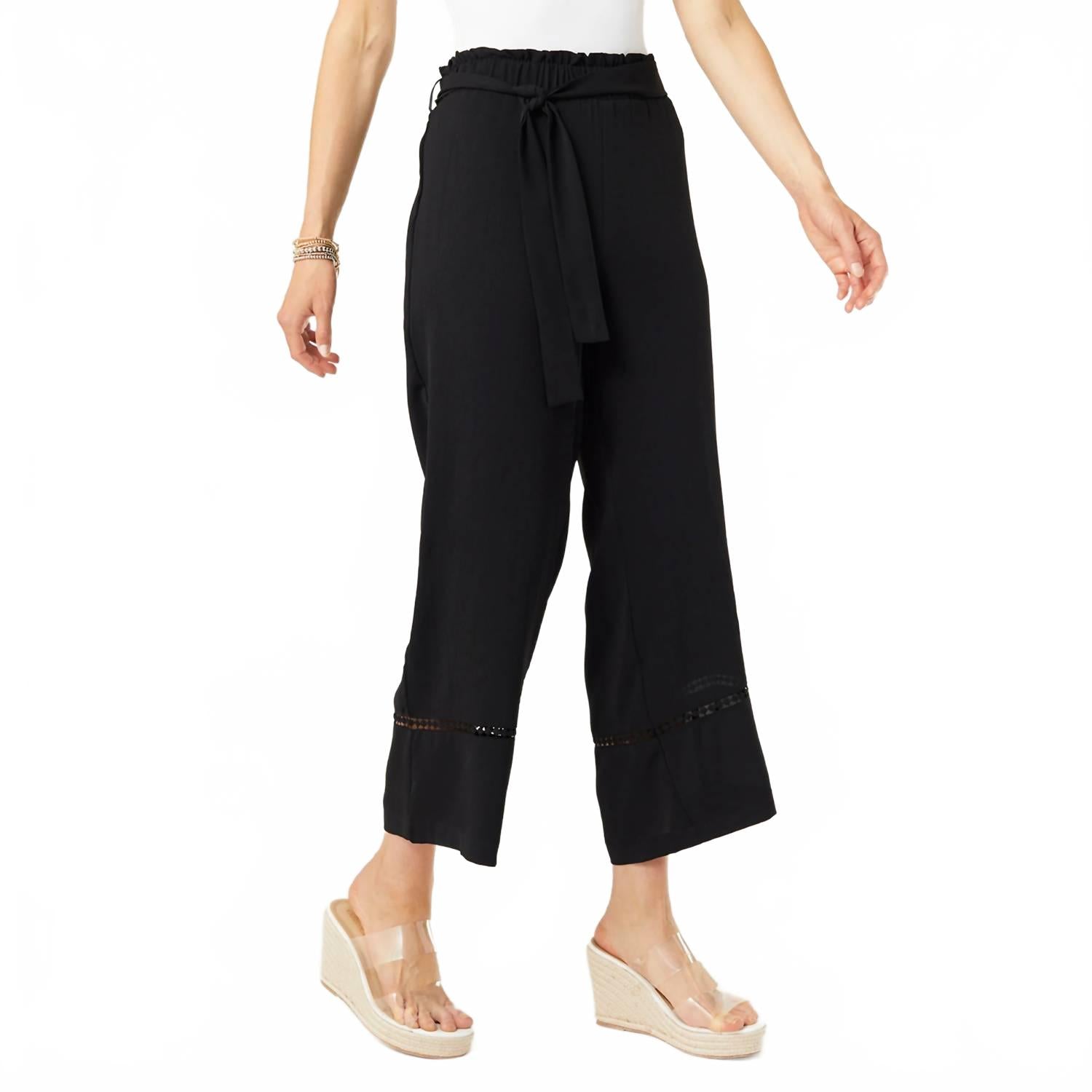 Ощутите комфорт в течение всего дня в брюках Karsyn от COCO + CARMEN в элегантном черном цвете. Эти брюки с высокой посадкой и широкими штанинами имеют классический крой, эластичный пояс с оборкой и регулируемый завязкой для создания идеального образа. Изготовленные из легкого полиэстера, они отличаются однотонным узором с легким оттенком бохо-стиля благодаря вязаной крючком детали на штанине. Застежка: надевайте. Идеально подходит для минималистичных весенних образов или праздничной вечеринки.