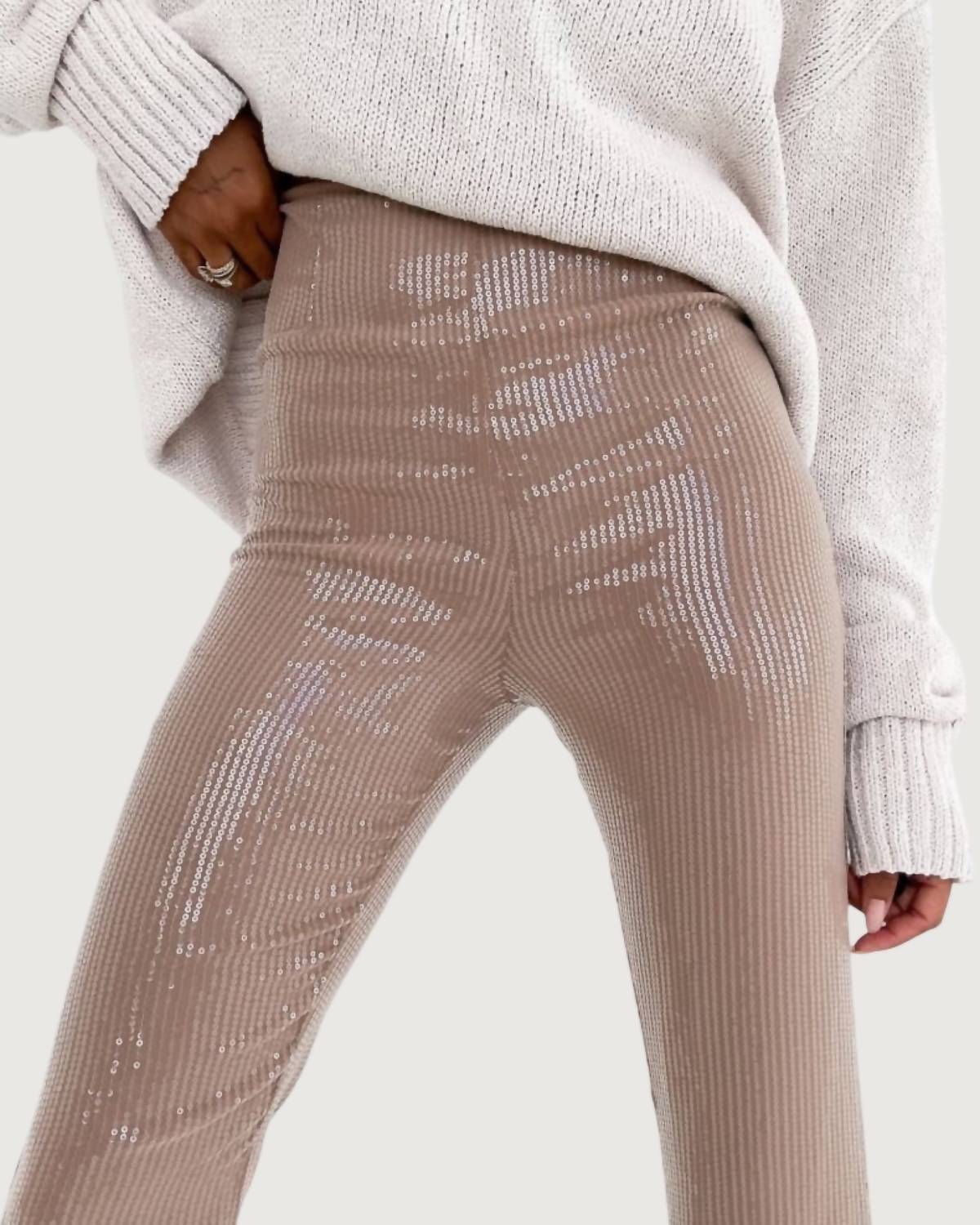 Окажитесь в центре внимания в брюках Falling Star от Rumored, воплощении гламура и элегантности. Эти расклешенные брюки с высокой талией и невидимой застежкой-молнией выполнены из легкого жоржета с пайетками текстурированного бежевого цвета. Высота брюк составляет 30 см, а длина внутреннего шва - 88 см, что обеспечивает эффектный силуэт, идеальный для ночных вечеринок. Эти брюки на подкладке обеспечивают комфорт и элегантность, идеально подходят для новогодних праздников и других торжеств.