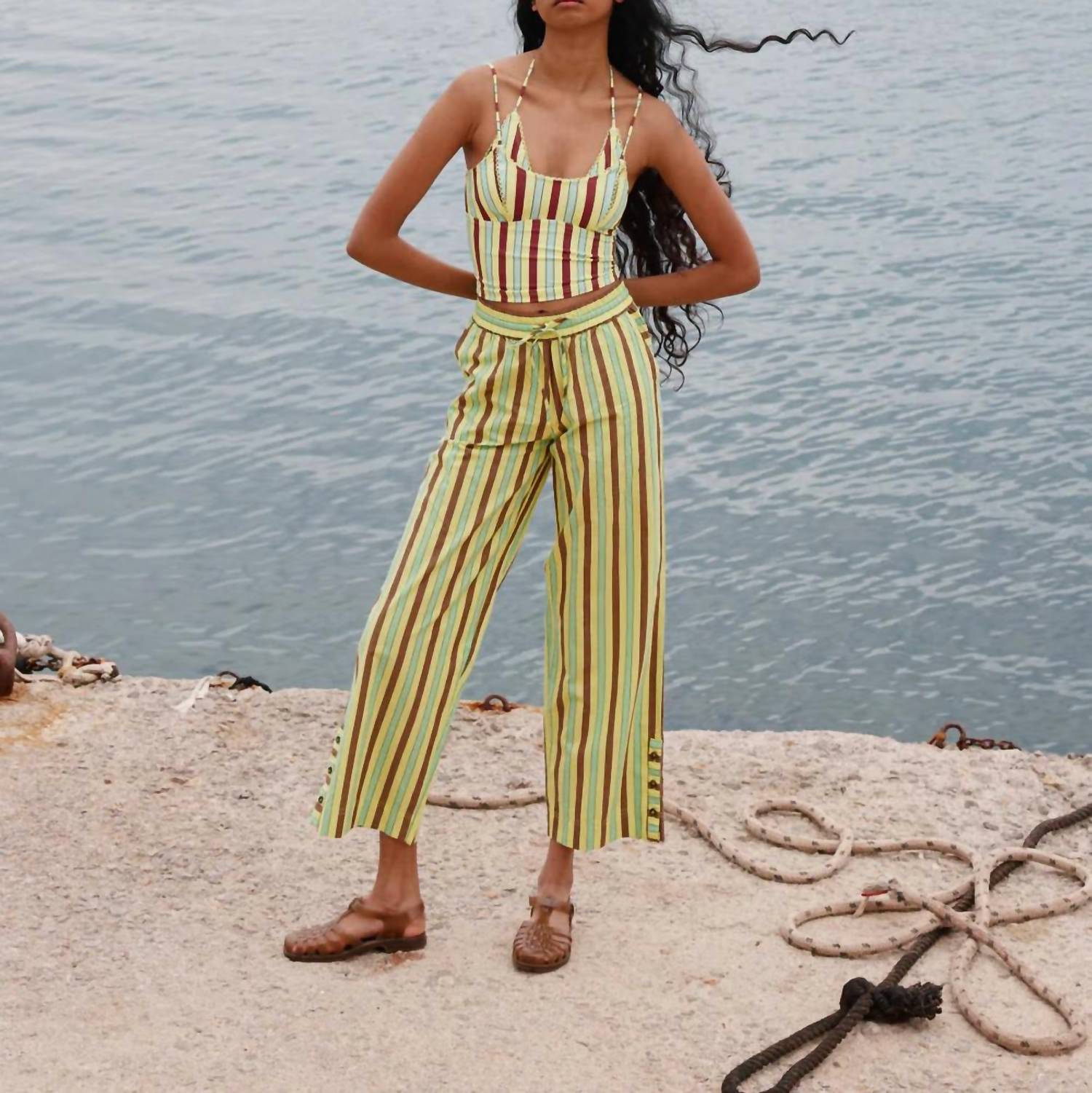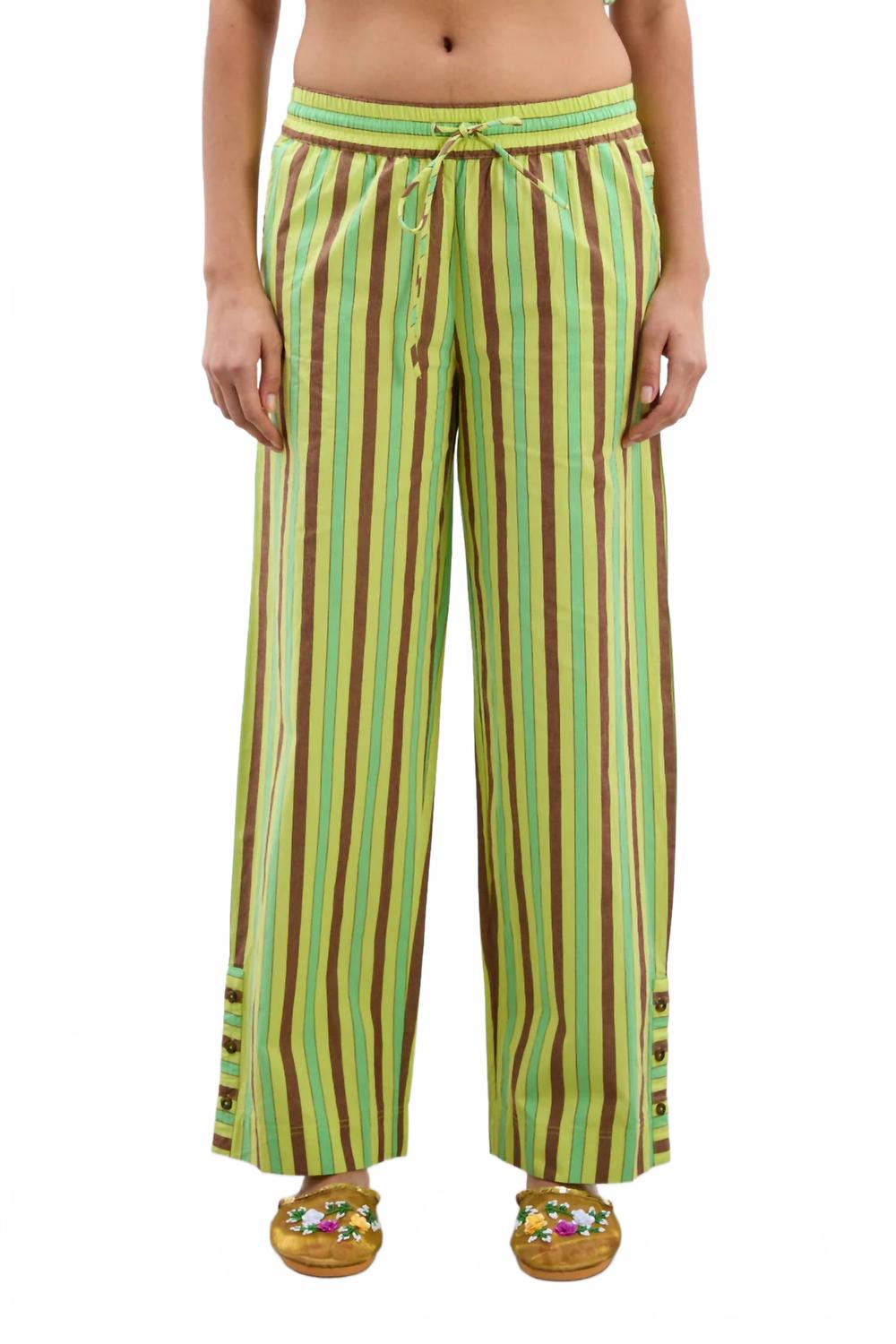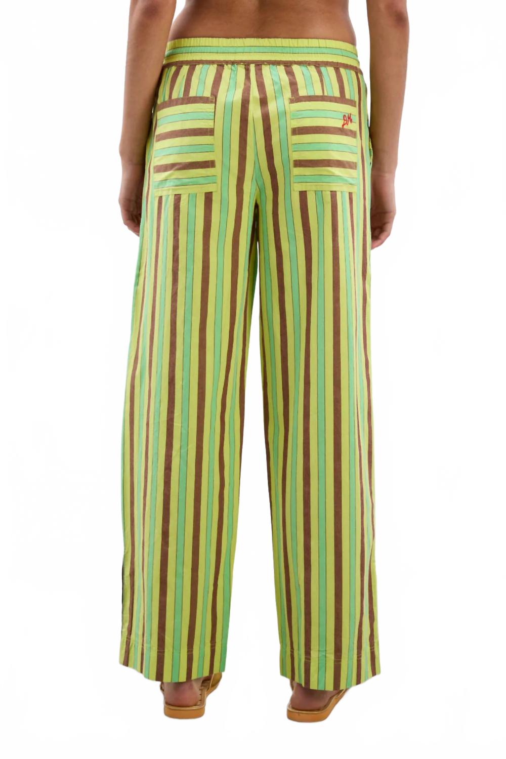 Эти брюки прямого кроя одновременно стильные и удобные. Мы уже говорили, что посадка идеальна? Откройте для себя непринужденный стиль с женскими брюками Ritik от Damson Madder яркого лаймового цвета с игривым тропическим полосатым узором. Эти брюки прямого кроя с низкой посадкой и эластичным поясом на завязках обеспечивают дополнительный комфорт. Эти брюки из 100% органического хлопка, произведенные в Индии, оснащены удобными задними карманами и пуговицами по низу штанины. Они идеально сочетаются с вашими любимыми топами и платьями, создавая полноценный летний образ.