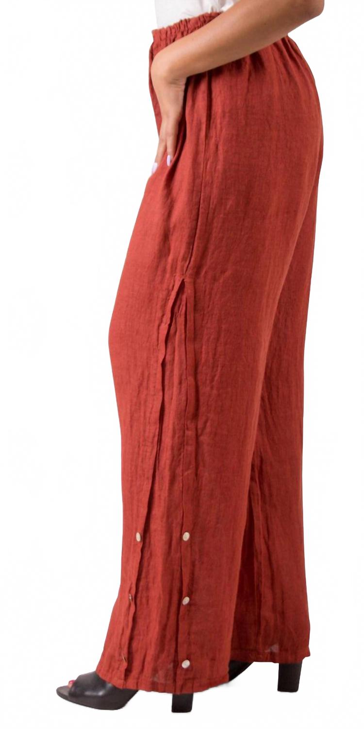 Представляем широкие брюки Sundaze от GIGI MODA насыщенного ржавого оттенка, идеально дополняющие ваш летний гардероб. Эти брюки свободного кроя с удобной застежкой-липучкой и декоративными пуговицами по низу. Изготовленные из 100% льна, они обеспечивают дышащий комфорт в теплую погоду. Эти брюки, сделанные в Италии, идеально подходят для путешествий и повседневной носки. Их легко стирать в стиральной машине и сушить в стиральной машине.