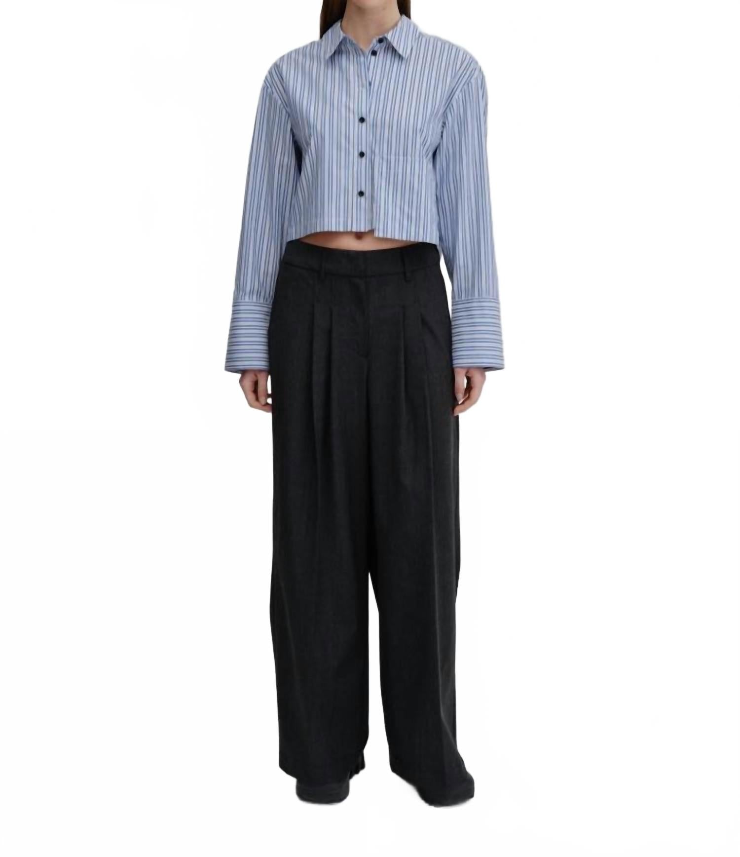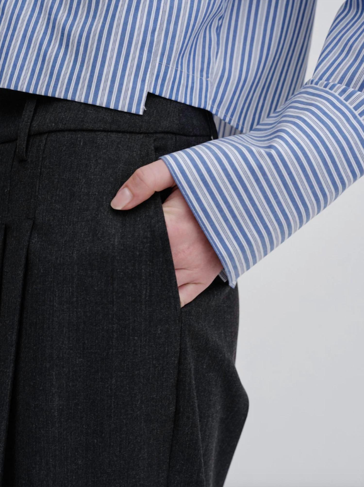 Повседневные брюки свободного кроя со средней посадкой на талии и широкими брючинами со стрелками. С косыми карманами спереди и карманами с бахромой сзади.* Повседневные брюки свободного кроя* Средняя посадка на талии* Прямые брюки* Карманы спереди и сзади* Заглаженные складки спереди и сзади* Темно-серый. 58% полиэстер, 21% натуральная шерсть, 18% вискоза, 3% эластан. Размер: 32 = US 234 = US 436 = US 638 = US 840 = US 10