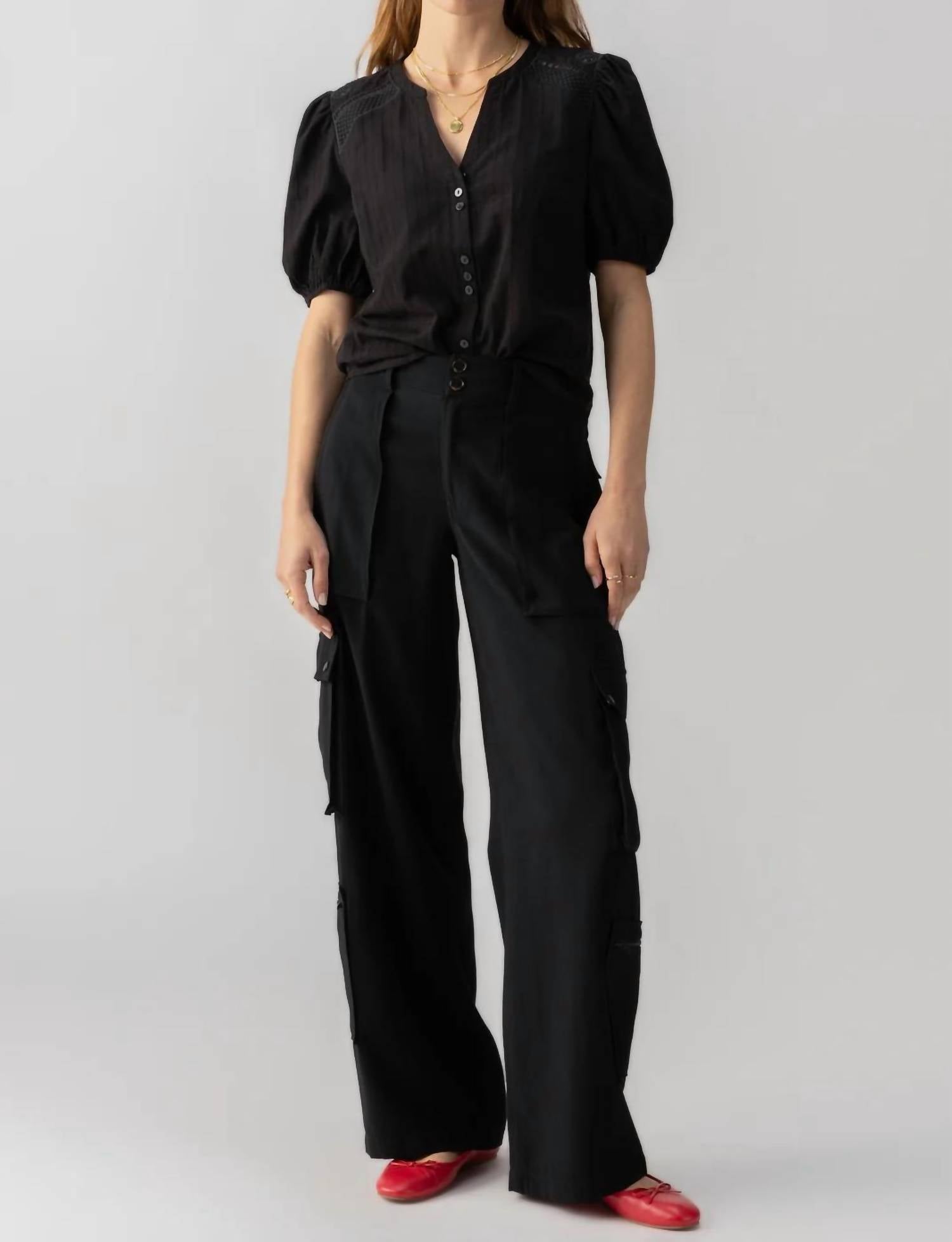 Добавьте изысканности в свой гардероб с брюками-карго Otto от Sanctuary - стильным дополнением универсального черного цвета. Эти широкие брюки с полувысокой посадкой обеспечивают свободный крой и изготовлены из 92% вискозы и 8% полиэстера для комфорта и стиля. Благодаря множеству карманов - 2 спереди, 2 с клапанами сзади и 4 накладных - они практичны и в то же время стильны. Застежка - молния с пуговицей. Уход - машинная стирка, сушка на веревке. Длина внутреннего шва 32 1/2 дюйма (86 см) и ширина брючины 22 дюйма (52 см) обеспечивают комфортную повседневную носку. Импортные.