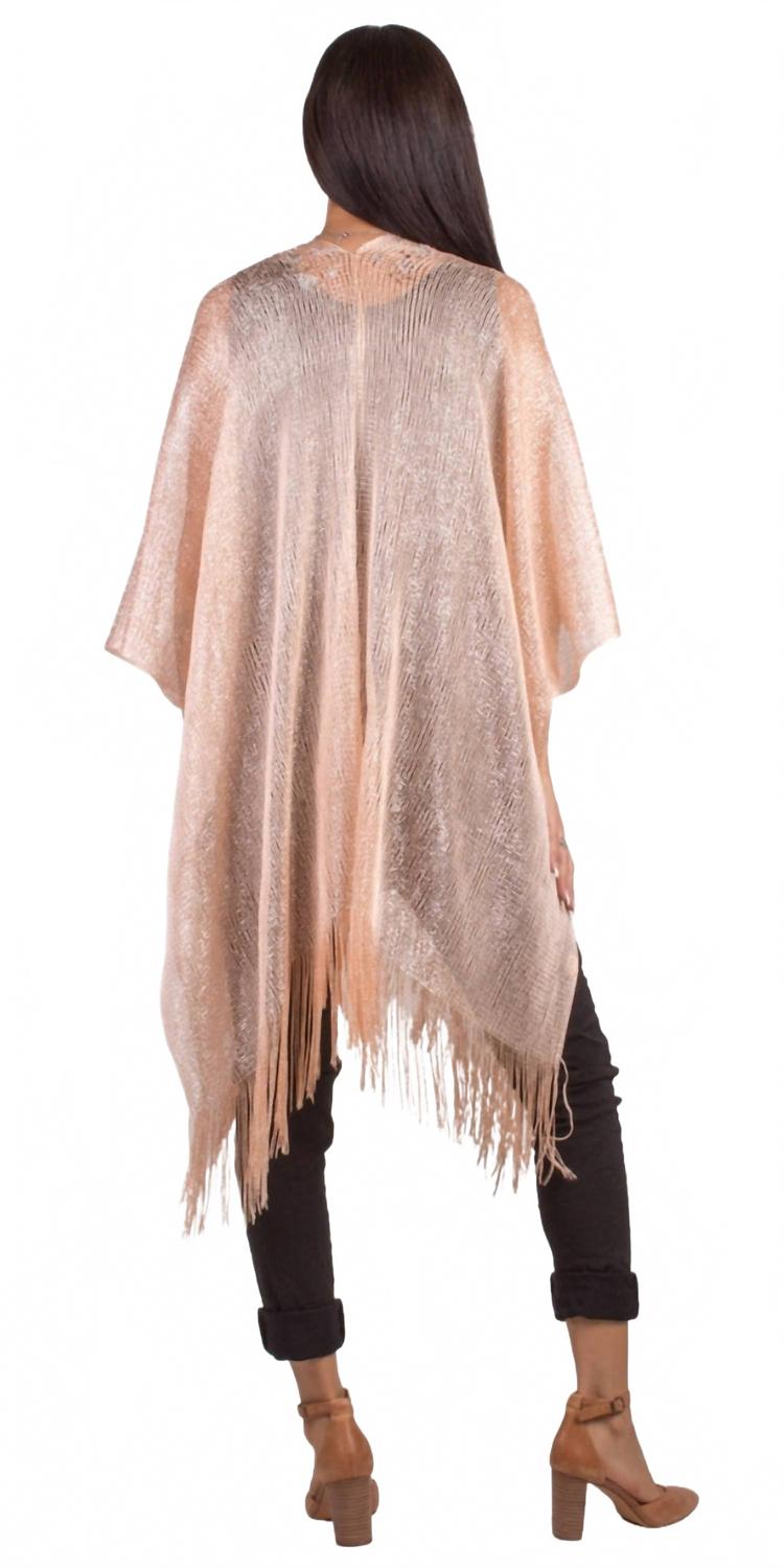 Классический крой, который одинаково хорошо смотрится как застегнутым, так и расстегнутым. Дополните свой осенний гардероб кимоно Spiaggia Open Front от GIGI MODA - стильным дополнением к любому наряду. Это кимоно персикового оттенка с рукавами три четверти и круглым вырезом идеально подойдет для создания теплого и стильного образа. Изготовленное из 100% полиэстера, оно выполнено из мерцающей сетчатой ​​ткани, украшенной блестящими деталями, и дополнено бахромой по низу, что добавляет ему изысканности. Благодаря удобной застежке-липучке, это кимоно удобно носить и требует простого ухода: ручная стирка и сушка на веревке. Рост модели: 175 см.