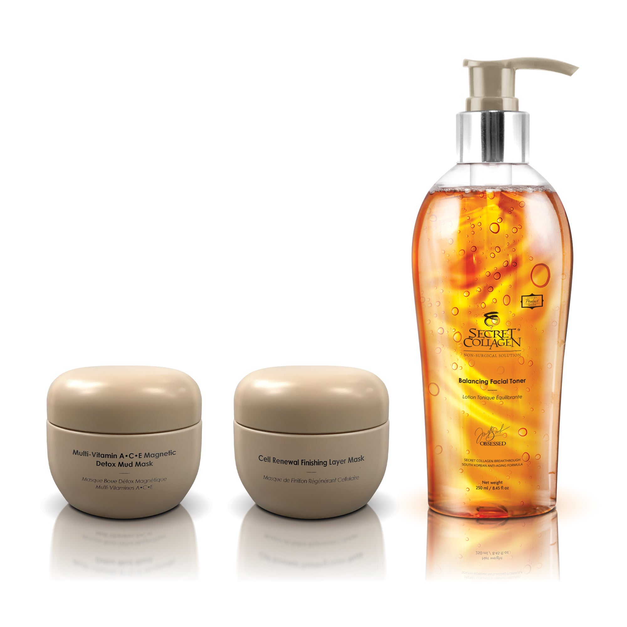 Добавьте в свой роскошный ритуал ухода за кожей Secret Collagen Age-Defying Total Renewal Trio - незаменимый набор, призванный создать идеальную основу для здоровой и сияющей кожи. Этот трехэтапный ритуал обеспечит тщательное очищение, восстановление баланса кожи и оптимальную подготовку к максимальному впитыванию последующих антивозрастных сывороток и увлажняющих средств.