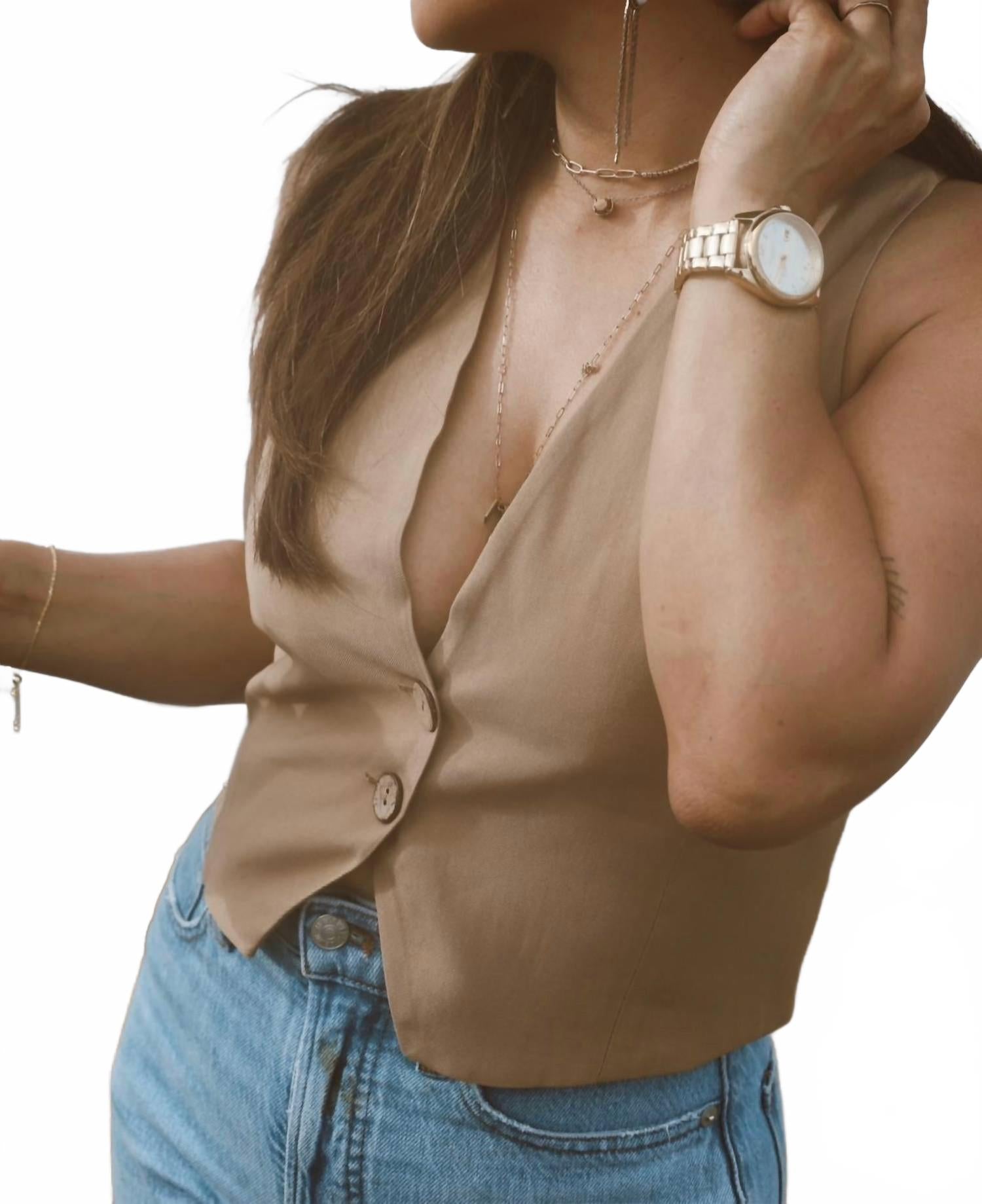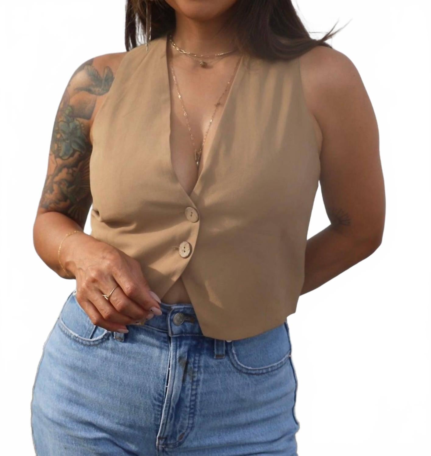 Тот самый дополнительный элемент многослойности, о котором вы даже не подозревали! Добавьте изысканности в свой гардероб с жилетом Muse Suit Vest от MIOU MUSE - незаменимым помощником в создании образа ковбойши из прибрежных ковбойских верблюдиц. Этот жилет без рукавов сшит из шикарной льняной ткани, состоящей на 60% из вискозы и на 40% из льна, и застегивается на две пуговицы спереди. Укороченный и скошенный подол добавляет уникальный штрих, дополненный овальным вырезом и завязкой сзади. Жилет выполнен в однотонном бежевом цвете и имеет подкладку для дополнительного комфорта. Рекомендуется стирать вручную и сушить на веревке, чтобы сохранить его качество.