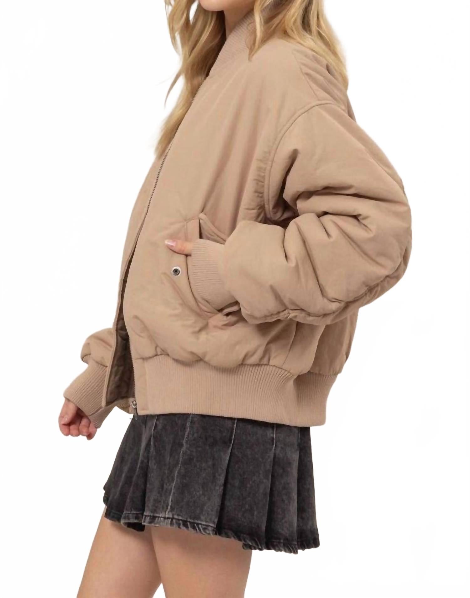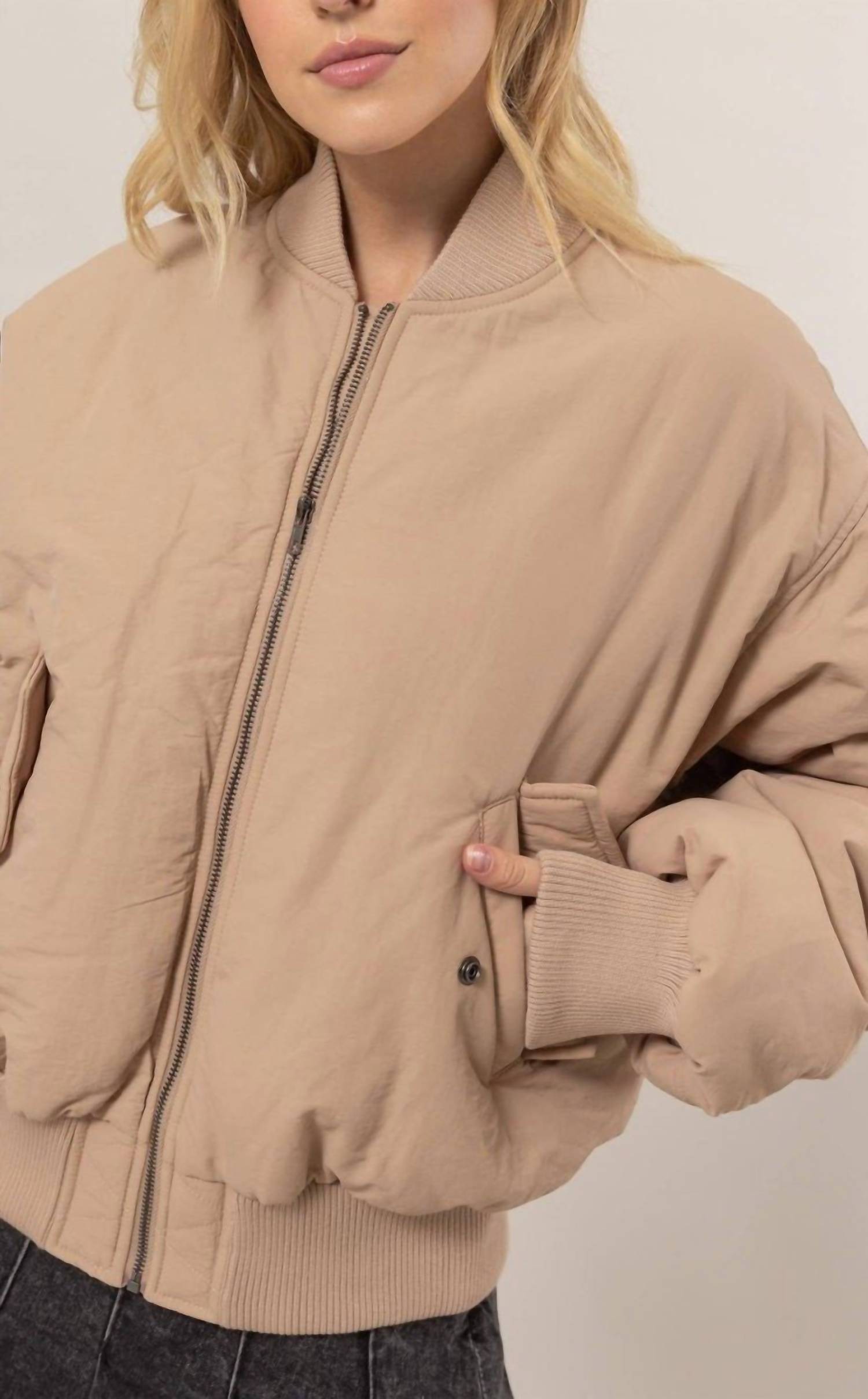 Уютная, милая и вне времени. Пуховик, который будет согревать вас в любое время года. Пуховик Bella Oversize Bomber от HYFVE, в однотонном бежевом оттенке, идеально сочетает в себе стиль и функциональность для зимних поездок. Эта куртка с длинными рукавами, изготовленная из 100% полиэстера, имеет удобный свободный крой, идеально подходящий для многослойного ношения, и дизайн с воротником-стойкой. Надежная застежка-молния и боковые карманы повышают практичность, в то время как она тщательно продумана в США. Для удобства ухода просто стирайте в стиральной машине. Доступные размеры включают обхват груди: S (34-35 дюймов), M (36-37 дюймов), L (38-39 дюймов). Модель ростом 5 футов 6 дюймов, обхват груди 32 дюйма, обхват талии 24 дюйма и обхват бедер 32 дюйма, на ней размер S.