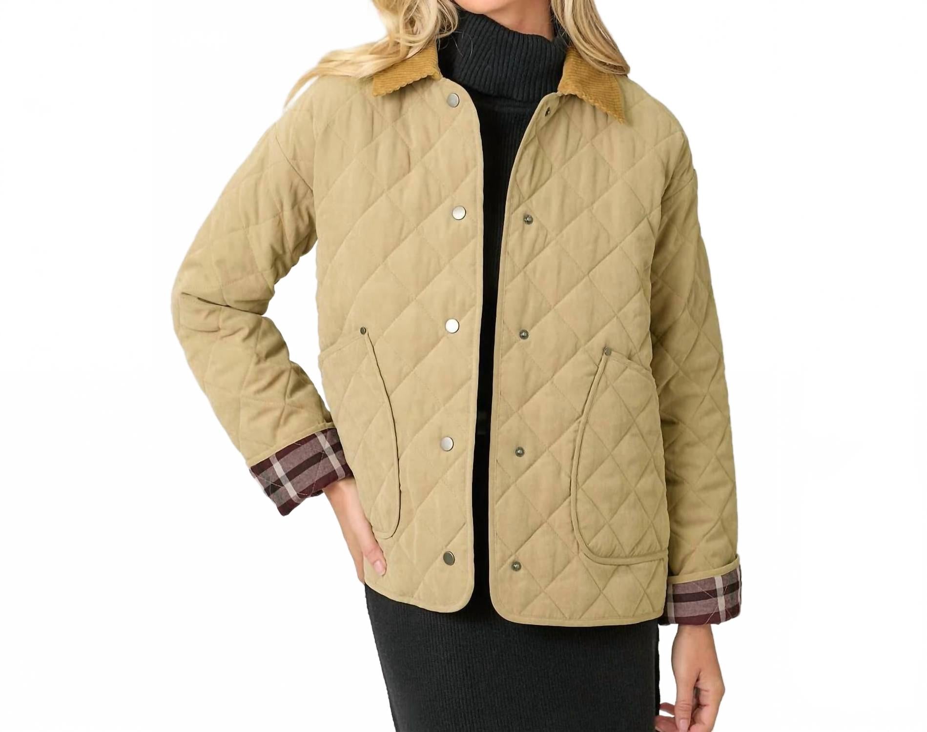 Уютная, милая и вне времени. Эта стеганая куртка согреет вас в любое время года. Это стеганая куртка с ромбовидным узором и застежкой на кнопки спереди. Вельветовый воротник и клетчатая подкладка видны на подвернутых манжетах. Куртка имеет два закругленных кармана спереди для хранения мелочей. Свободный крой позволяет носить ее поверх свитеров или топов. На модели куртка надета поверх черного платья с высоким воротником.