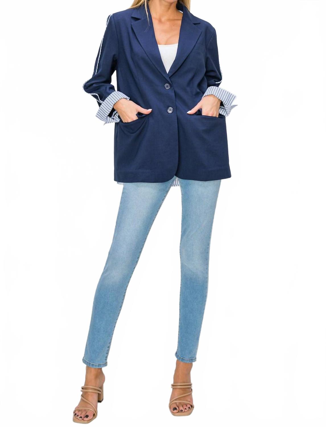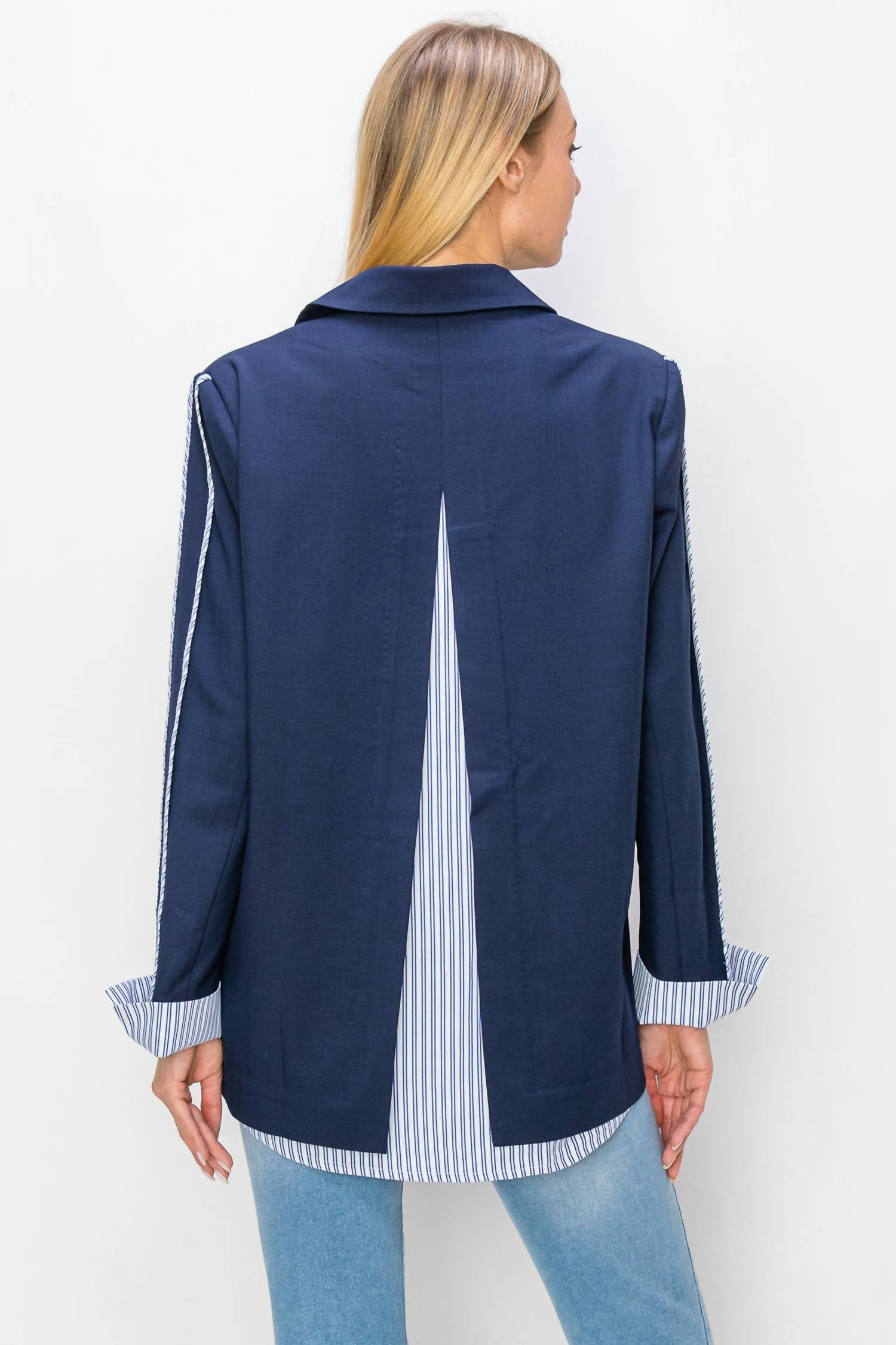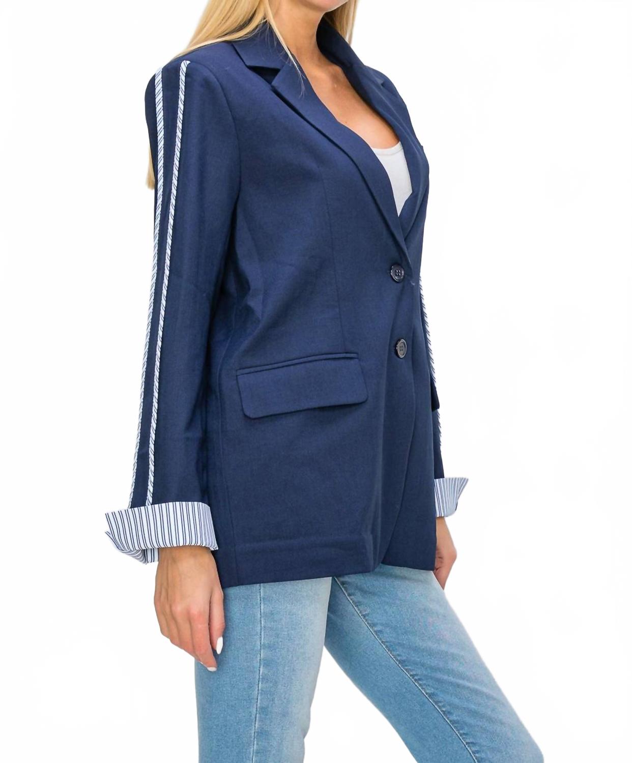 Добавьте нотку изысканности в свой гардероб с пиджаком Mary Blazer в полоску от Joh. Этот женский пиджак с модным темно-синим полосатым узором имеет длинные рукава и застежку на пуговицы, создавая элегантный образ. Уникальный дизайн с контрастными полосками на рукавах и манжетах идеально подходит для стильного званого ужина или празднования Дня благодарения. Этот пиджак, созданный специально для осени, станет незаменимой вещью для поклонников моды 90-х.