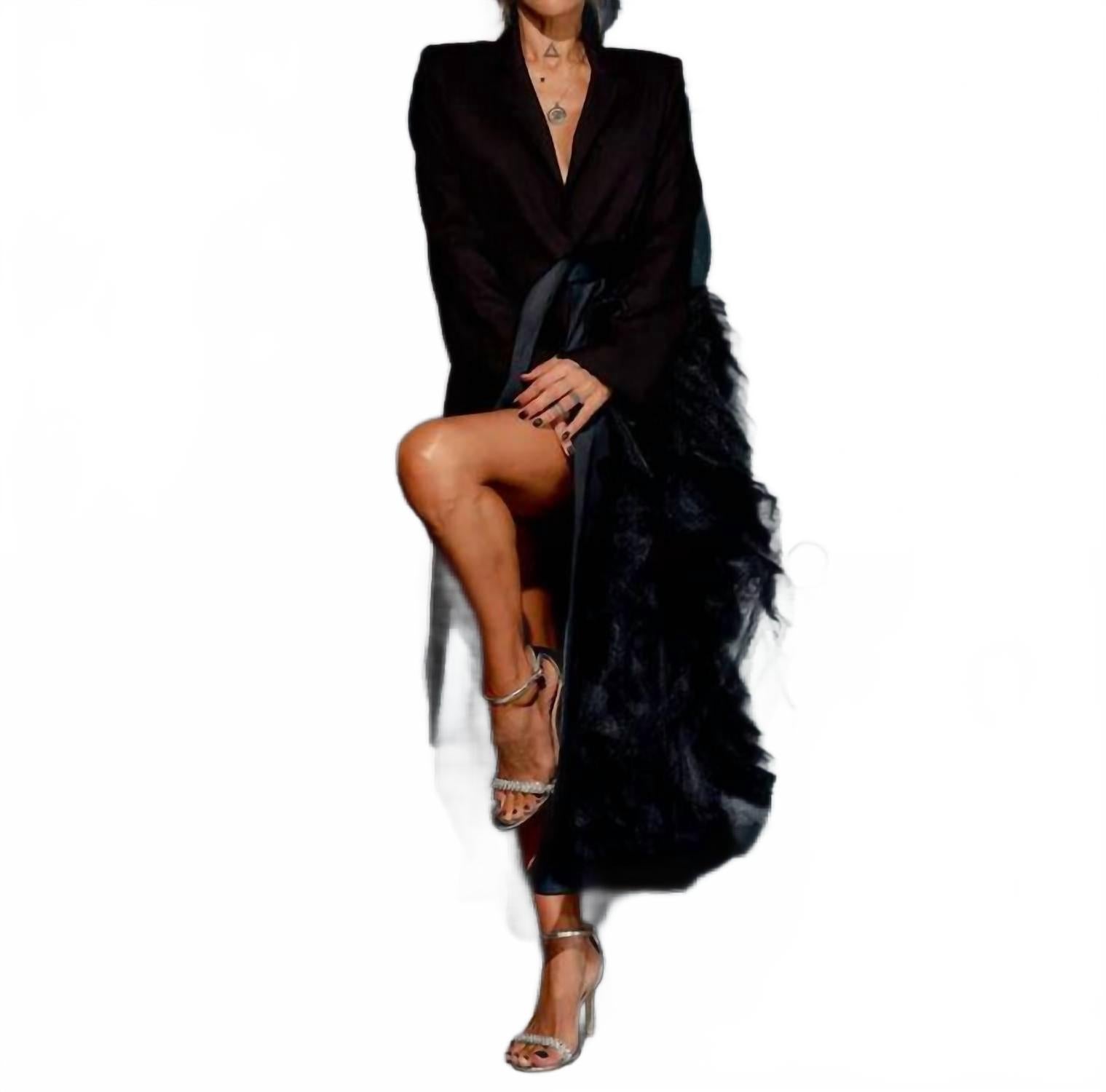 Идеально скроенный, этот блейзер станет вашим незаменимым аксессуаром на долгие годы. Представляем блейзер с тюлевой отделкой от Locker Room - эффектное дополнение к вашему вечернему гардеробу в классическом черном цвете. Длинные рукава и эффектная асимметричная вставка из тюля создают эффектный объем и текстуру. Изготовленный из 100% полиэстера, он имеет среднюю длину и приталенный крой с атласным поясом и высоким воротником. Застежка: надевайте. Уход: машинная стирка в холодной воде (30ºC) с мягким моющим средством.