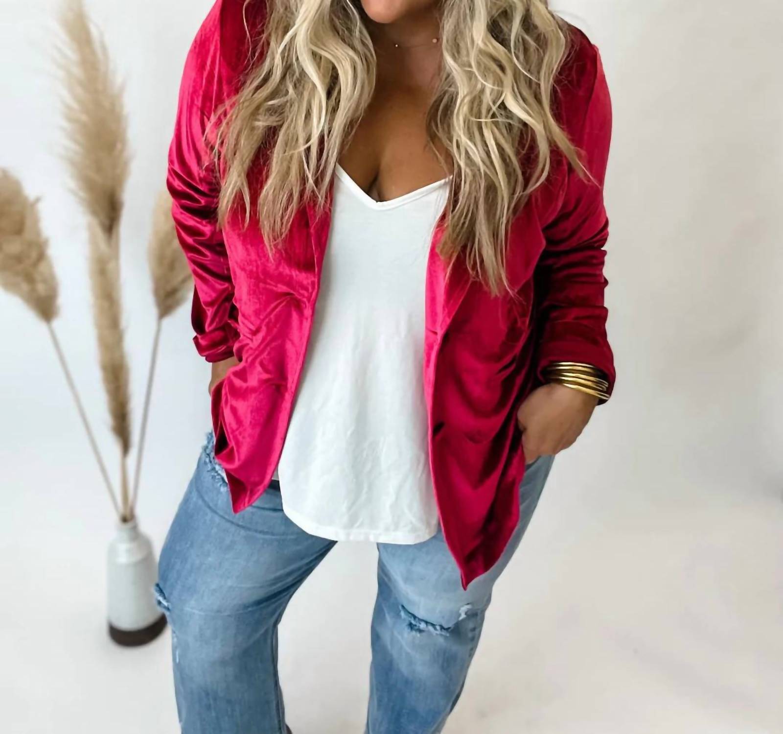 Усовершенствованная версия вашего любимого классического блейзера. Украсьте свой гардероб бархатным блейзером Everything We Knew от BLAKELEY - эффектной вещью насыщенного винного цвета. Этот блейзер с длинными рукавами изготовлен из смеси 95% полиэстера и 5% спандекса для дополнительной эластичности и комфорта. Он застегивается на функциональные пуговицы спереди и имеет боковые карманы, а мягкая эластичная подкладка обеспечивает удобную посадку. Этот блейзер идеально подходит для придания изысканности любому образу, так как отличается классическим воротником и однотонным узором.