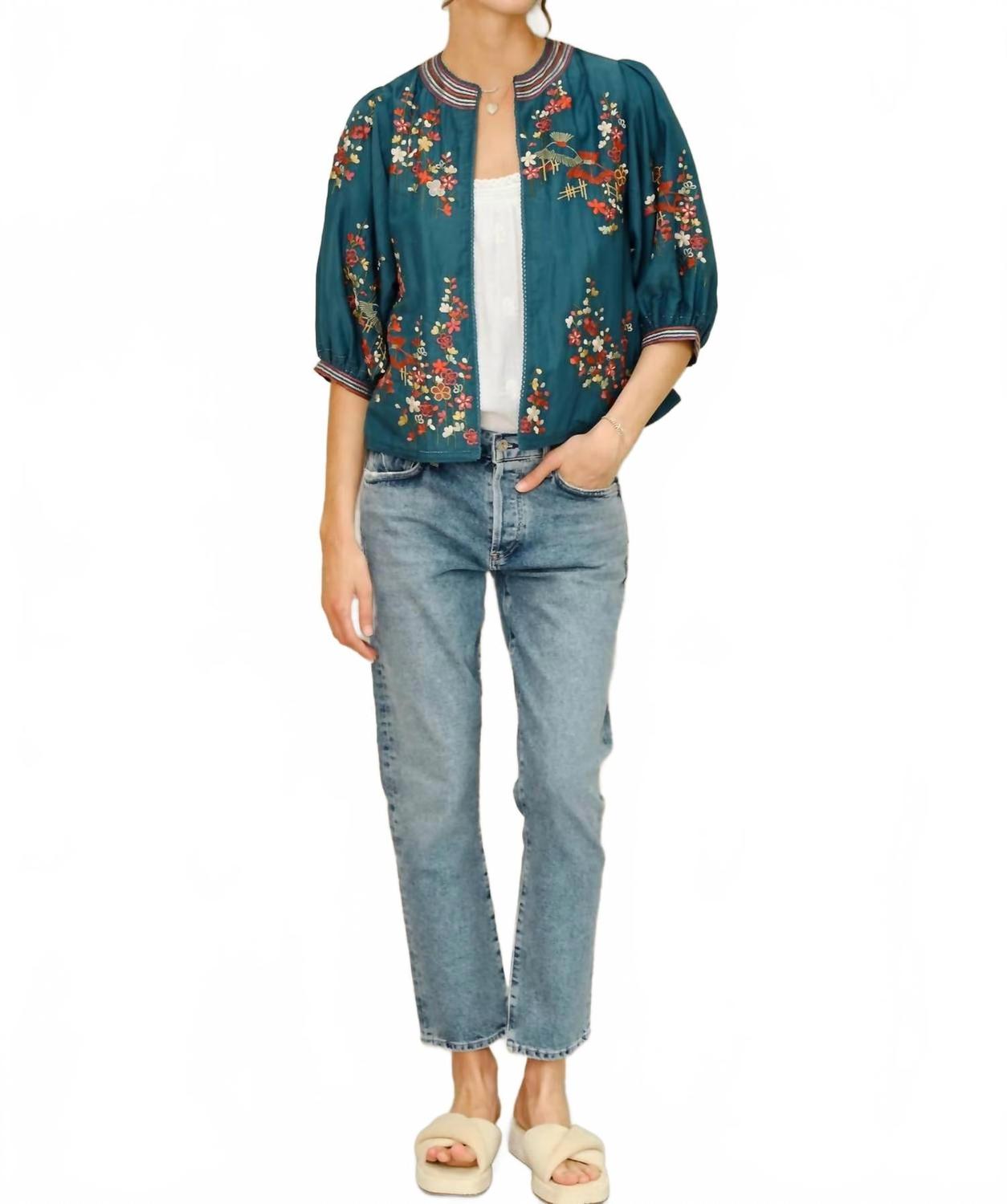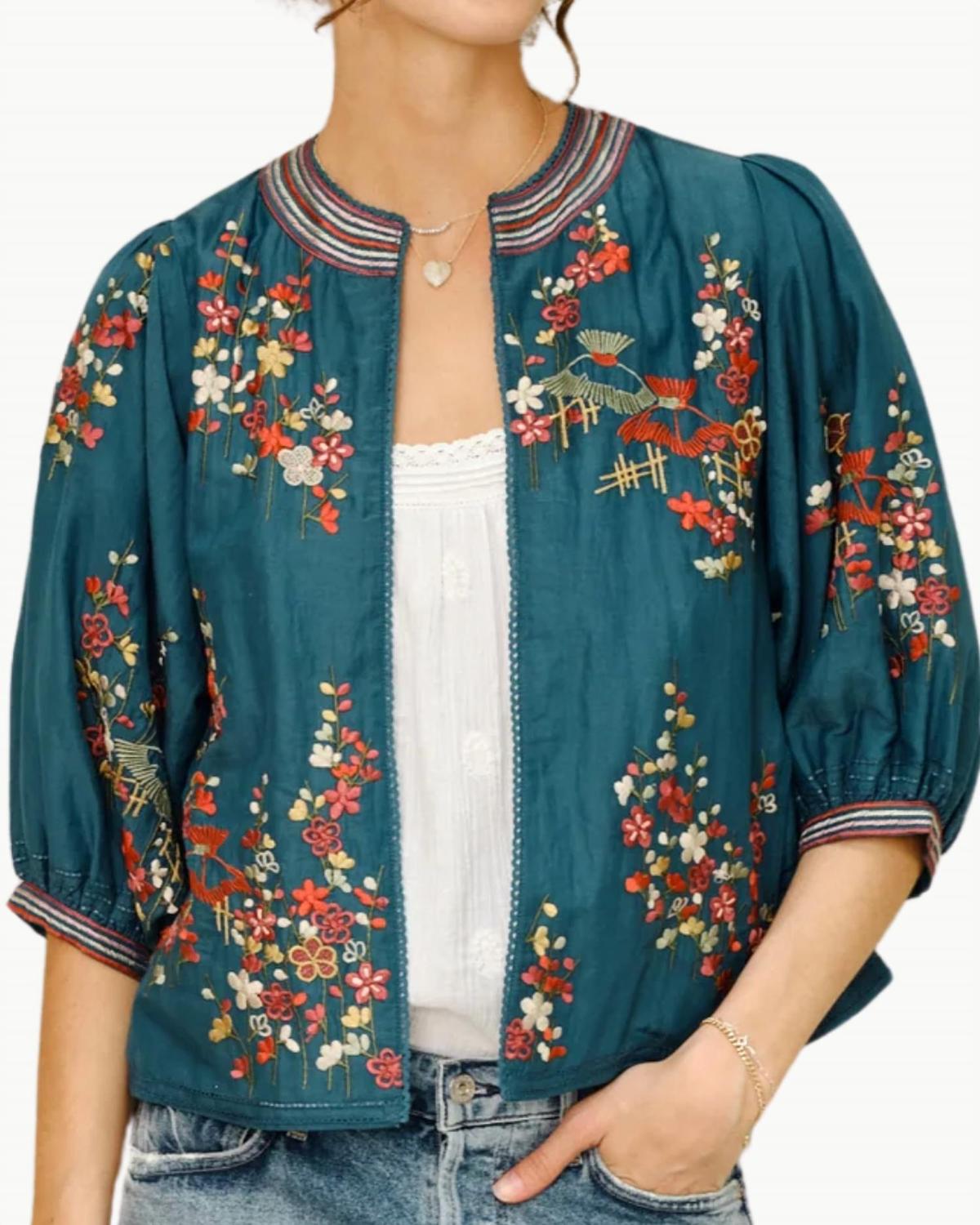 Милая, повседневная и удобная. Эта куртка - просто необходимая вещь. Ощутите харизматичное очарование куртки Emi от MABE - очаровательного женского изделия в успокаивающем синем оттенке. Эта куртка с рукавами три четверти выполнена из тонкой смеси хлопка и шелка, украшенной потрясающей цветочной и геометрической вышивкой, а контрастная подкладка с цветочным принтом добавляет дополнительный шарм. Застежка: надевается на себя, обеспечивая удобство и элегантность. Эта модель свободного кроя с женственной драпировкой и присборенными рукавами идеально подходит для любого званого ужина, создавая образ в стиле бохо-шик, идеально подходящий для весеннего сезона.