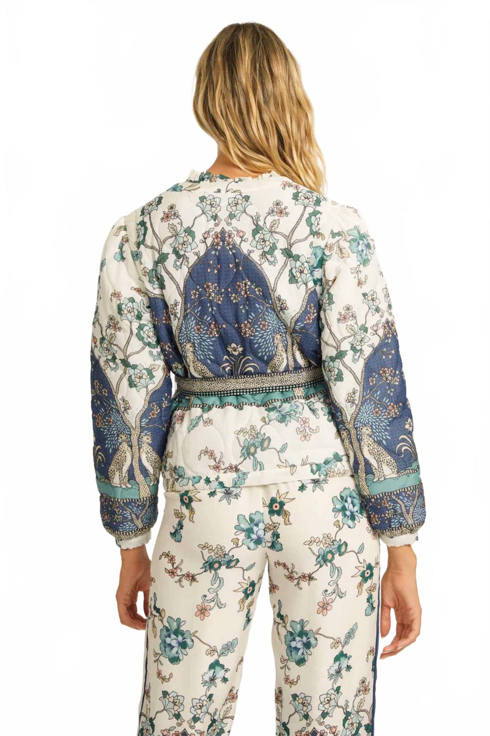 Воплощение непринужденного весеннего стиля. Длинные рукава украшены характерным рисунком гепарда на белом цветочном фоне, создавая неповторимый образ в стиле бохо-шик. Изготовлена из смеси 60% хлопка и 40% вискозы. Длина чуть ниже талии, пояс на завязке для создания привлекательного силуэта. Застежка на молнию. Эта двусторонняя куртка с эластичными манжетами и карманами, созданная для путешествий и повседневных мероприятий, добавит стильности и функциональности вашему гардеробу.