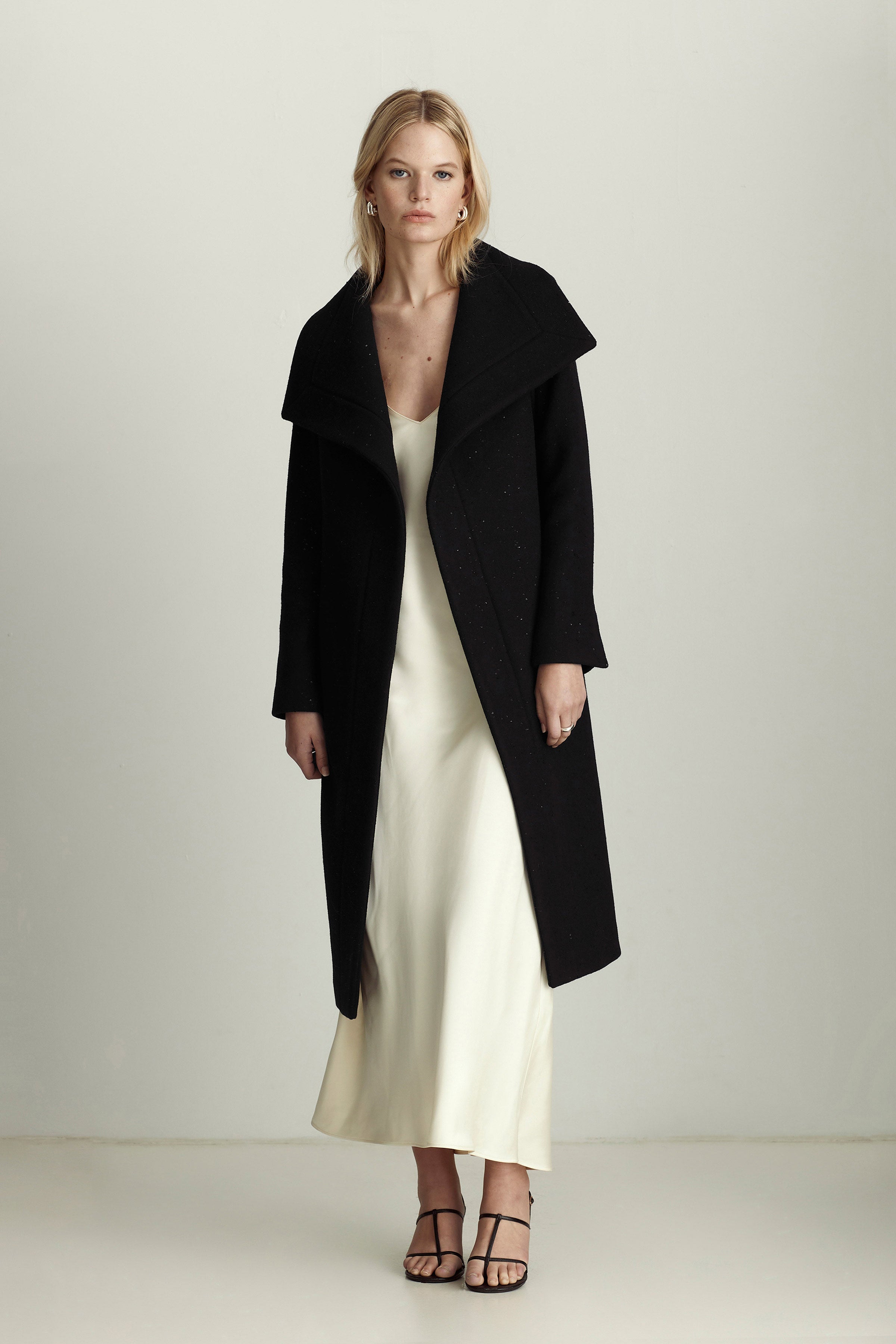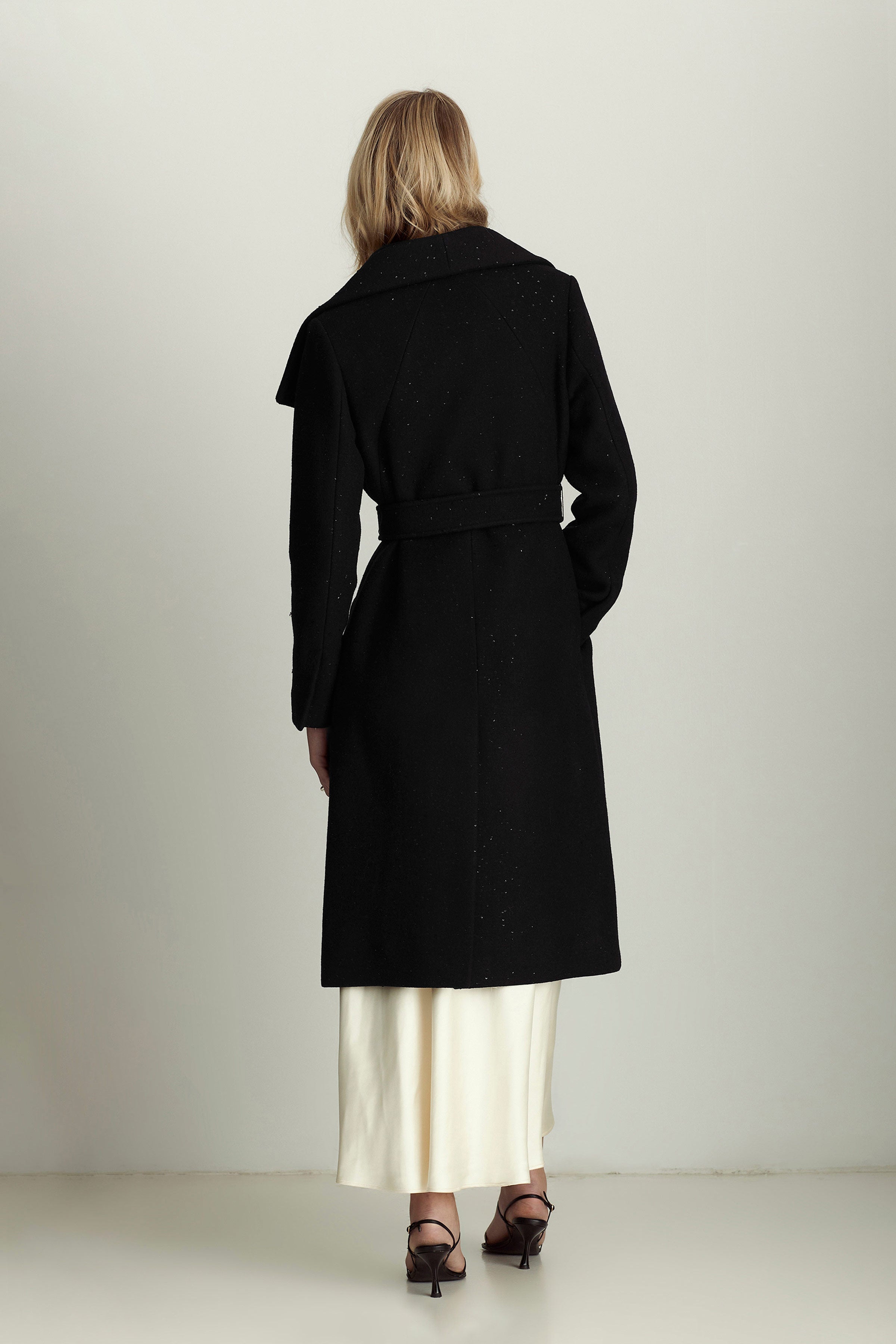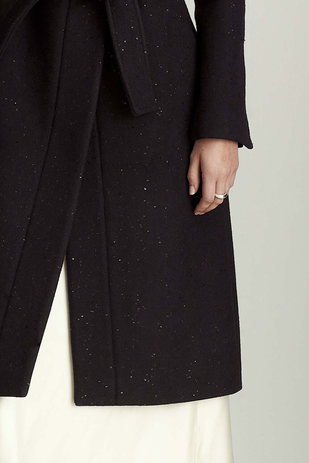 Эта версия нашего пальто-халата Gisele с пайетками вдохновлена изысканным блеском ночного неба. Мелкие блестки, рассыпанные по мягкой шерсти чернильно-черного цвета, элегантно сочетаются с широким воротником-стойкой и поясом-завязкой - идеальное решение как для вечеринок в стиле black tie, так и для неформальных ужинов.