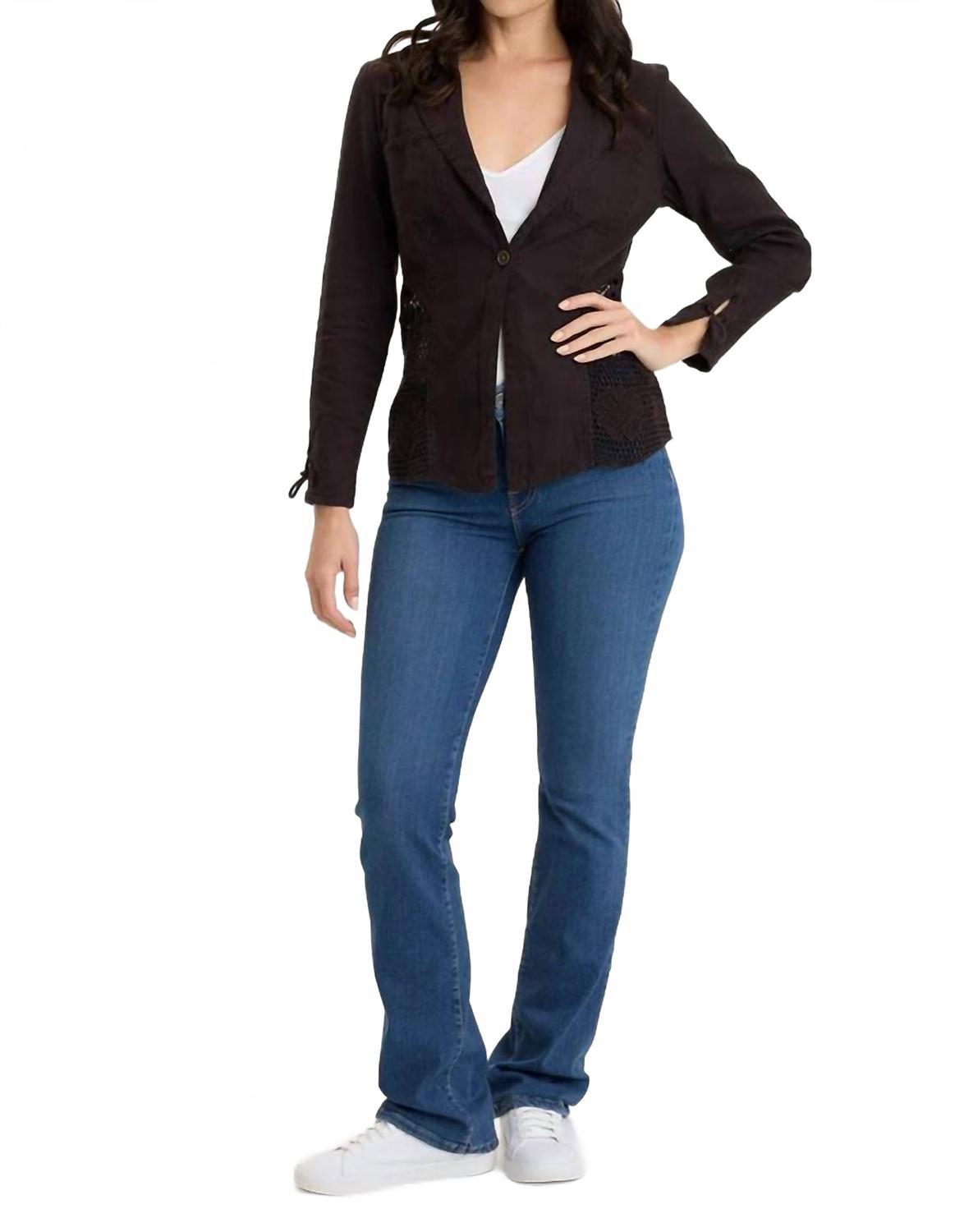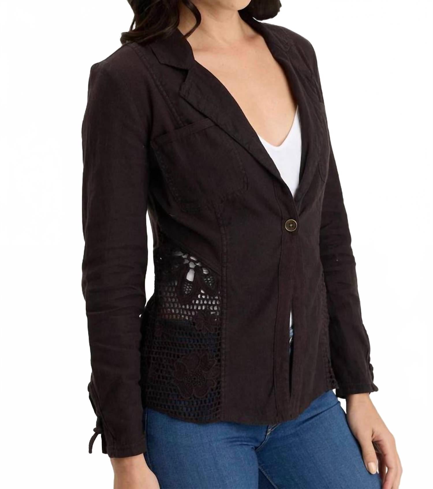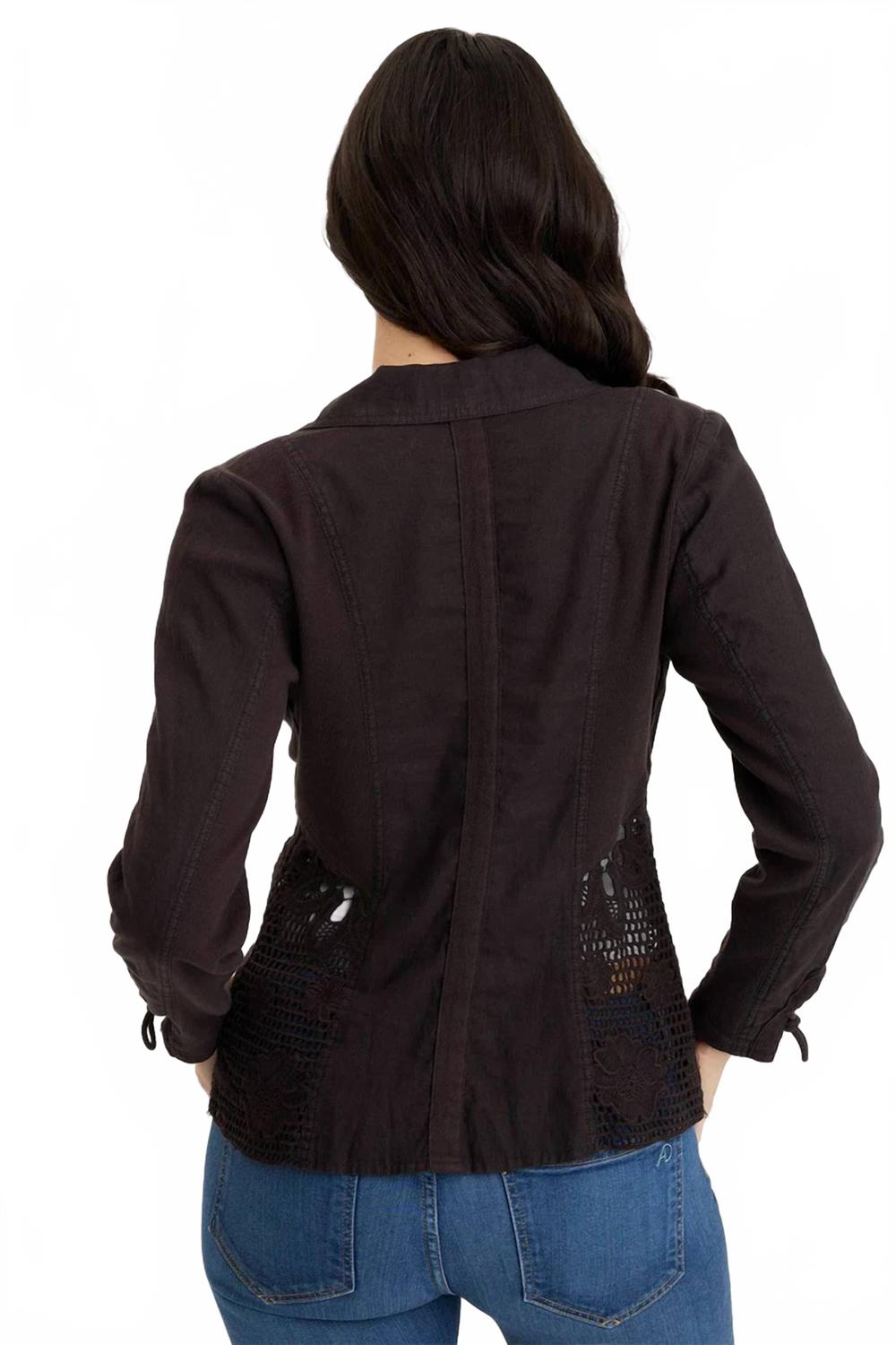 Откройте для себя куртку XCVI Trinket - идеальный выбор для современных вечерних мероприятий благодаря своему черному дизайну с рисунком. Этот пиджак с длинными рукавами украшен изысканным сетчатым и цветочным узором, связанным крючком, а также разрезами на рукавах, застежкой на одну латунную пуговицу и удобными нагрудными карманами. Куртка изготовлена из смеси 78% льна и 22% хлопка с боковыми вставками из хлопка, связанными крючком. Длина куртки составляет около 58 см по центру переда и спинки. Благодаря эластичным вставкам в рубчик, она предварительно усажена и пригодна для машинной стирки, что делает ее незаменимой вещью в вашем рабочем гардеробе.