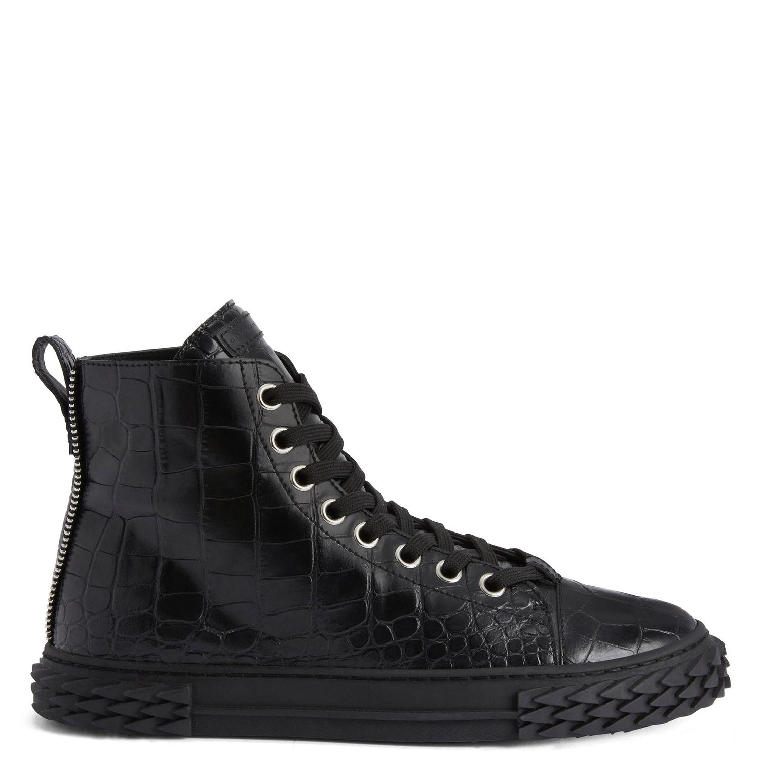 Мужские кроссовки. Черная ткань с крокодиловым принтом. Тисненый логотип на этикетке. Черная шнуровка. Черная резиновая подошва «Blabber» с логотипом. Сделано в Италии.