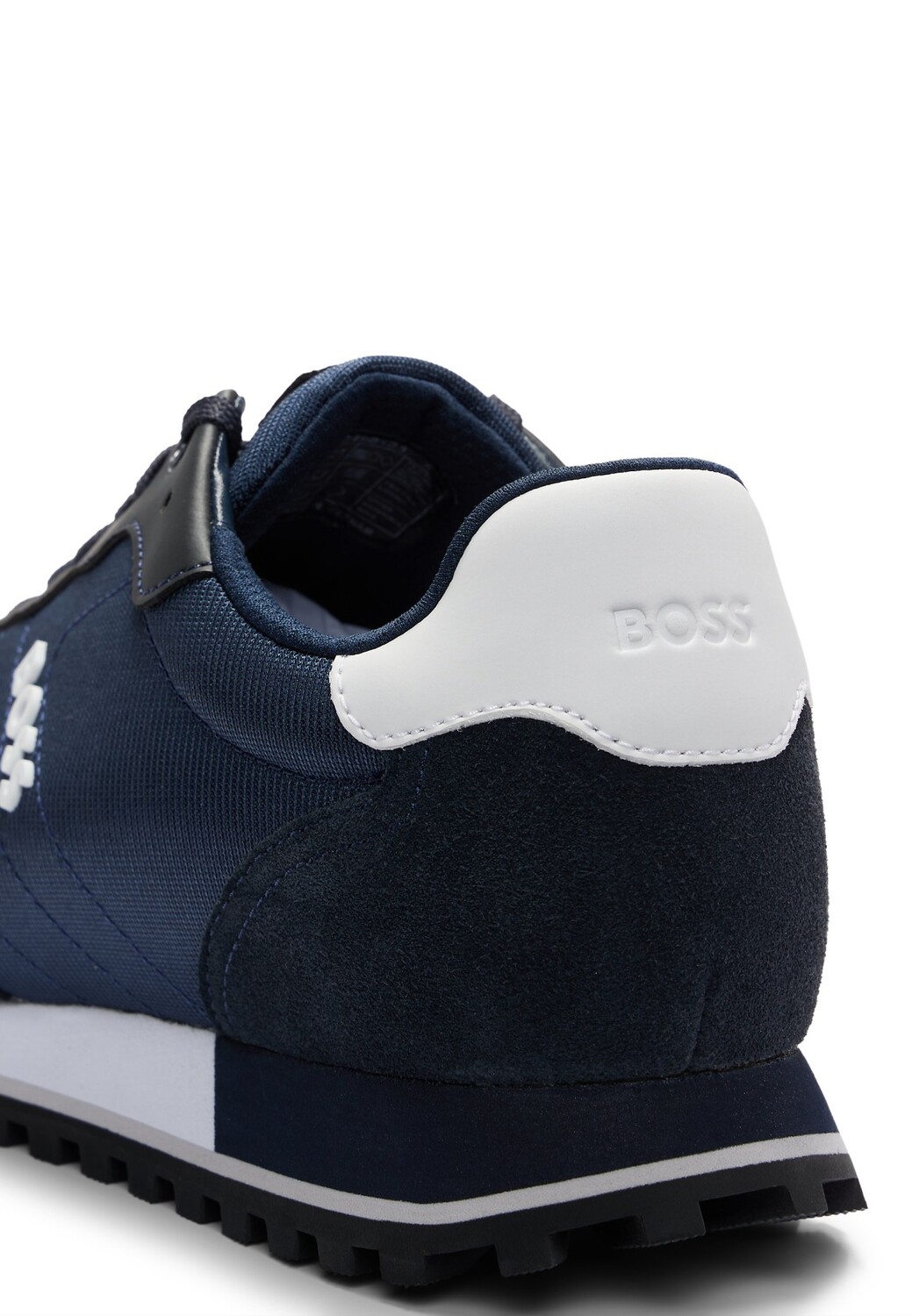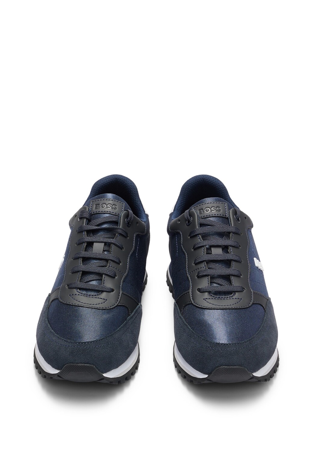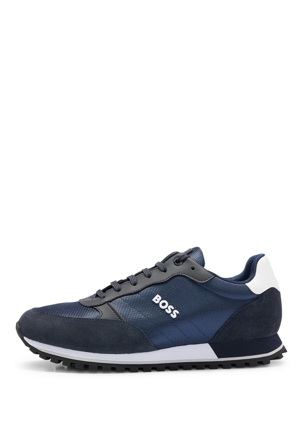 Характерные кроссовки BOSS, изготовленные из смеси материалов с рельефным логотипом сбоку.