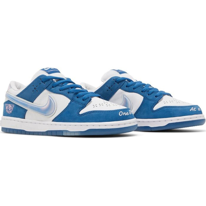 Модель Nike Born x Raised x Dunk Low SB 'One Block at a Time' привносит множество уникальных деталей в классический силуэт. Бренд из Лос-Анджелеса, специализирующийся на производстве уличной одежды, выполнил верх из текстурированной белой кожи с декоративной перфорацией на носочной части и контрастными накладками из нубука синего цвета Dodger. На носке модели нанесена надпись "One Block At A Time", а на боковой пятке - декоративная эмблема в виде розовой вышивки. Голографический эффект придает головокружение логотипу Swoosh и заднику, отмеченному линзовидным логотипом Born SB. Кроссовки установлены на белую резиновую промежуточную подошву с рельефной надписью "On The Turf" на пятке. Под подошвой из полупрозрачной синей резины виднеется крупный логотип Born SB.