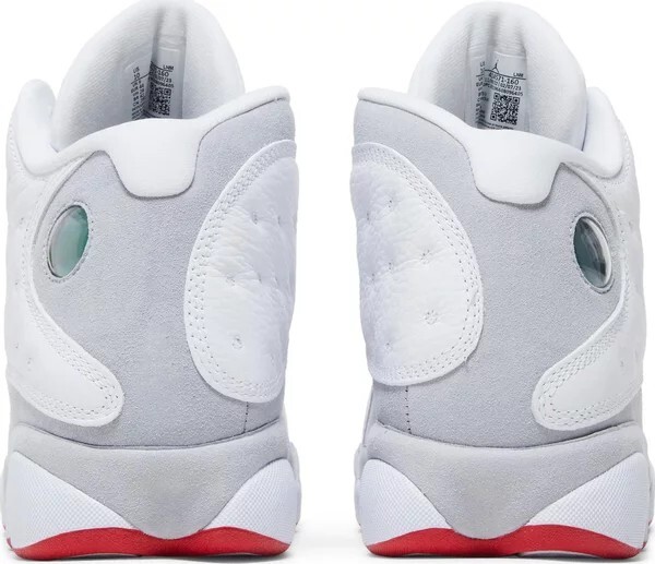Air Jordan 13 Retro «White Wolf Grey» представляет собой изысканную цветовую гамму старой модели, вдохновленную образом Майкла Джордана «Черный кот». Верх сочетает в себе белую кожаную основу с серыми вставками из синтетической замши и накладками с ямочками из белой мятой кожи. На язычке вышит алый логотип Jumpman, а боковой воротник украшен голографическим кошачьим глазом 13. Серая синтетическая замша покрывает межподошву Phylon, усиленную под стопой пластиной из углеродного волокна и красной подошвой в виде лапы пантеры.