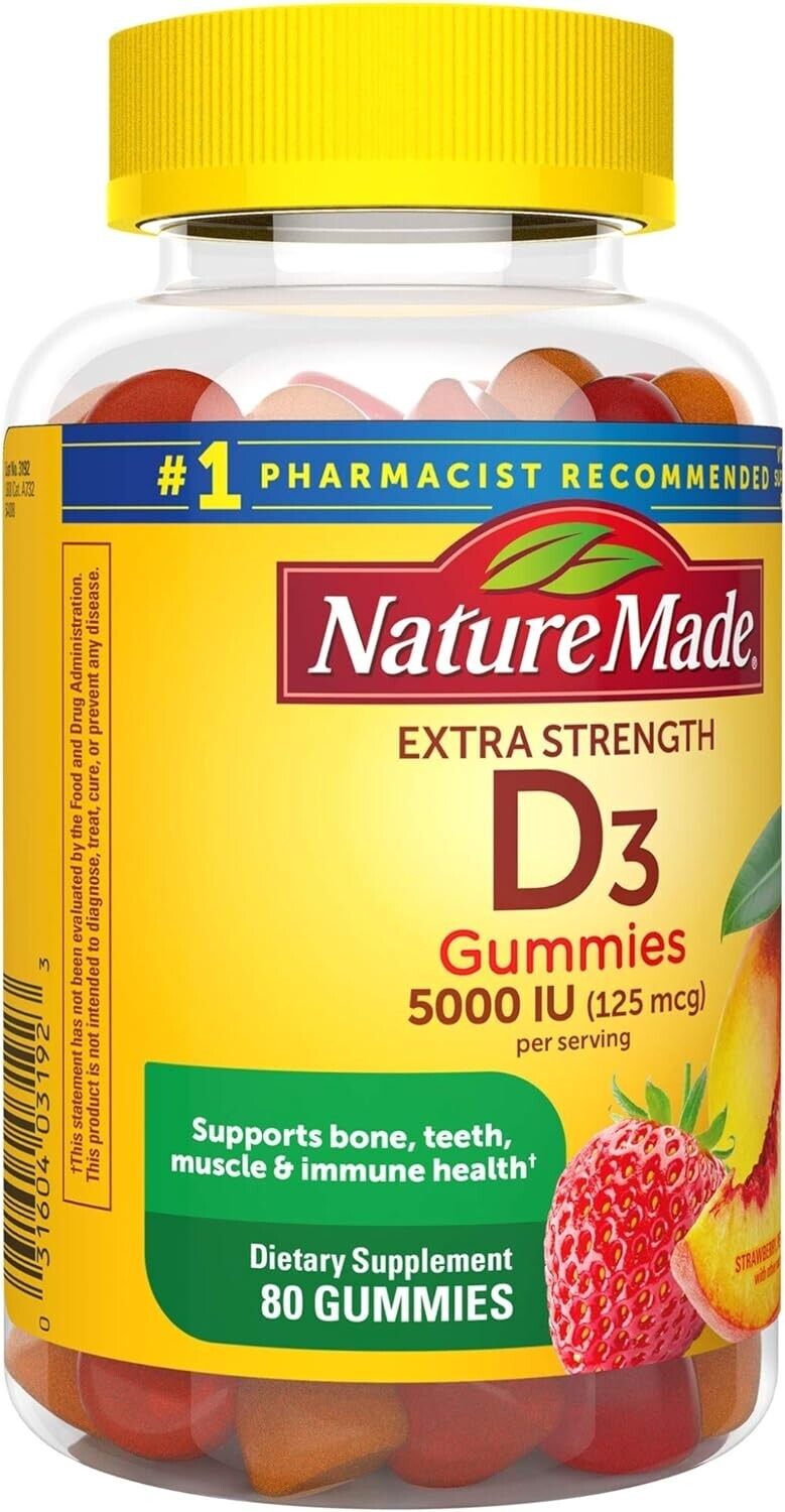 Добавка для поддержки здоровья иммунитета, мышц, зубов и костей. Витамин D повышенной силы Nature Made 5000 МЕ на две жевательные конфеты поддерживает здоровье костей, зубов, мышц и обеспечивает иммунную поддержку.