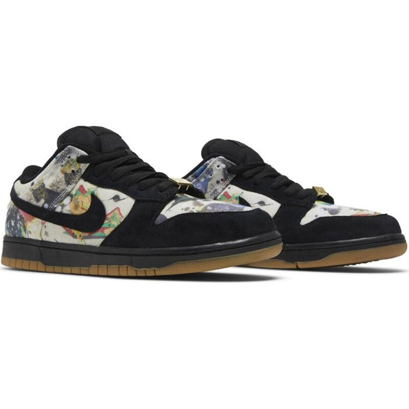 Nike Dunk Low SB х Supreme 'Rammellzee' объединяет скейт-бренд из Нью-Йорка и покойного художника, известного своими граффити и мультимедийными скульптурами. В центре сотрудничества - силуэт Dunk Low, верхняя часть которого покрыта холстом с оригинальными рисунками Раммелзи. Прочная черная замша использована для накладки на глаза, Swoosh и передней части стопы, а также для мягкого сетчатого язычка и текстильной подкладки воротника. Блестящие акценты придают шнурки 'Supreme' с золотистым металлическим покрытием. Прочная подошва имеет черные боковины и подошву из резины.