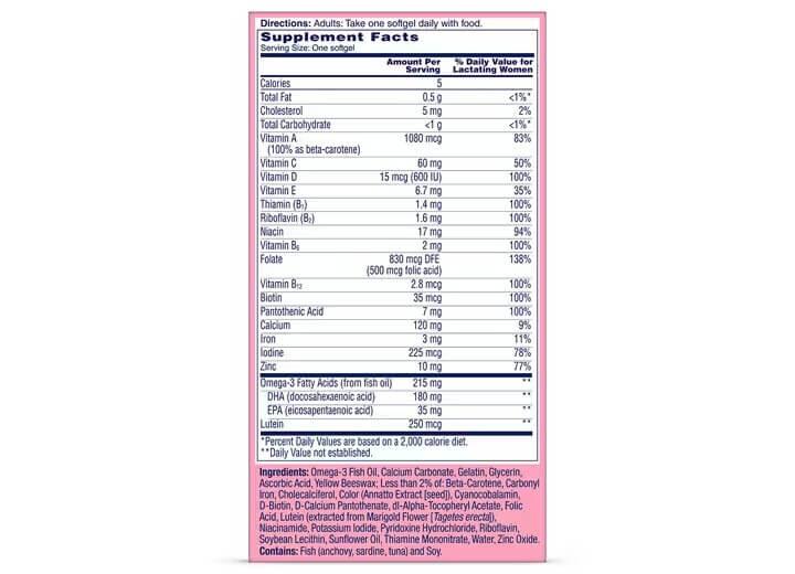 - Специально разработан с необходимыми витаминами, минералами и ДГК омега-3 для удовлетворения растущих потребностей мамы в питании во время грудного вскармливания и здорового развития ребенка.