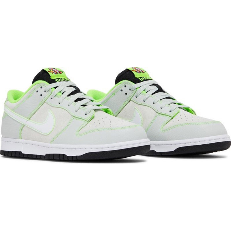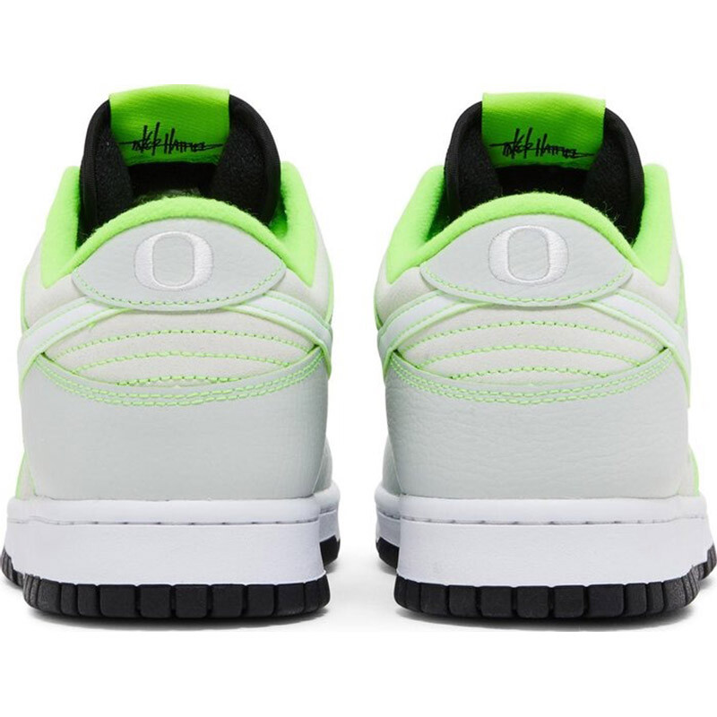 Первая модель Nike Dunk Low "University of Oregon" PE, разработанная Тинкером Хэтфилдом, имеет бледно-серебристый верх, состоящий из разделенной замши и кожи с PU-покрытием. На пятке вышита серебристая надпись "Oregon O", а Swoosh из гладкой зернистой кожи выполнен в белом цвете. Акценты цвета Electric Green расставлены на швах и внутреннем воротнике. На язычке расположен логотип университета Fighting Duck, а на обратной стороне пришита подпись Тинкера. На разноцветной подошве имеется надпись "Ducks of a Feather". Каждая пара помещена в специально разработанную коробку Go Ducks.