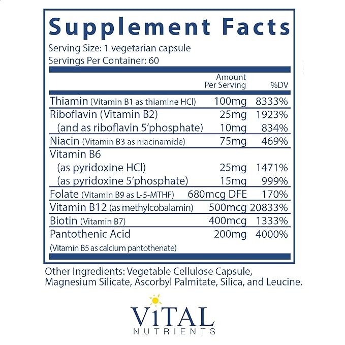 Vital Nutrients Vitamin B Complex - это высококачественный комплекс витаминов группы B, предназначенный для поддержки общего здоровья и энергии. Каждая капсула содержит оптимальное сочетание витаминов B1, B2, B3, B5, B6, B7, B9 и B12. Этот продукт помогает повысить уровень энергии, улучшить настроение, поддерживать нервную систему и обеспечивать здоровье волос, кожи и ногтей.