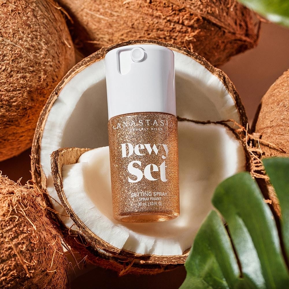 Спрей для фиксации макияжа Dewy Set от ANASTASIA BEVERLY HILLS с ароматом кокоса и ванили помогает идеально растушевывать косметические средства, фиксирует макияж и создает эффект свежей и слегка сияющей (но ни в коем случае не жирной) чистой кожи. Этот профессиональный спрей для фиксации макияжа нежный и идеально подходит для сухой кожи или для достижения особенно свежего, слегка сияющего эффекта. Средство на водной основе покрывает кожу, не утяжеляя ее, разглаживая и освежая. Используйте отдельно, чтобы придать коже здоровое сияние, подготовить кожу к равномерному нанесению макияжа или закрепить макияж, чтобы он выглядел свежим и сияющим.