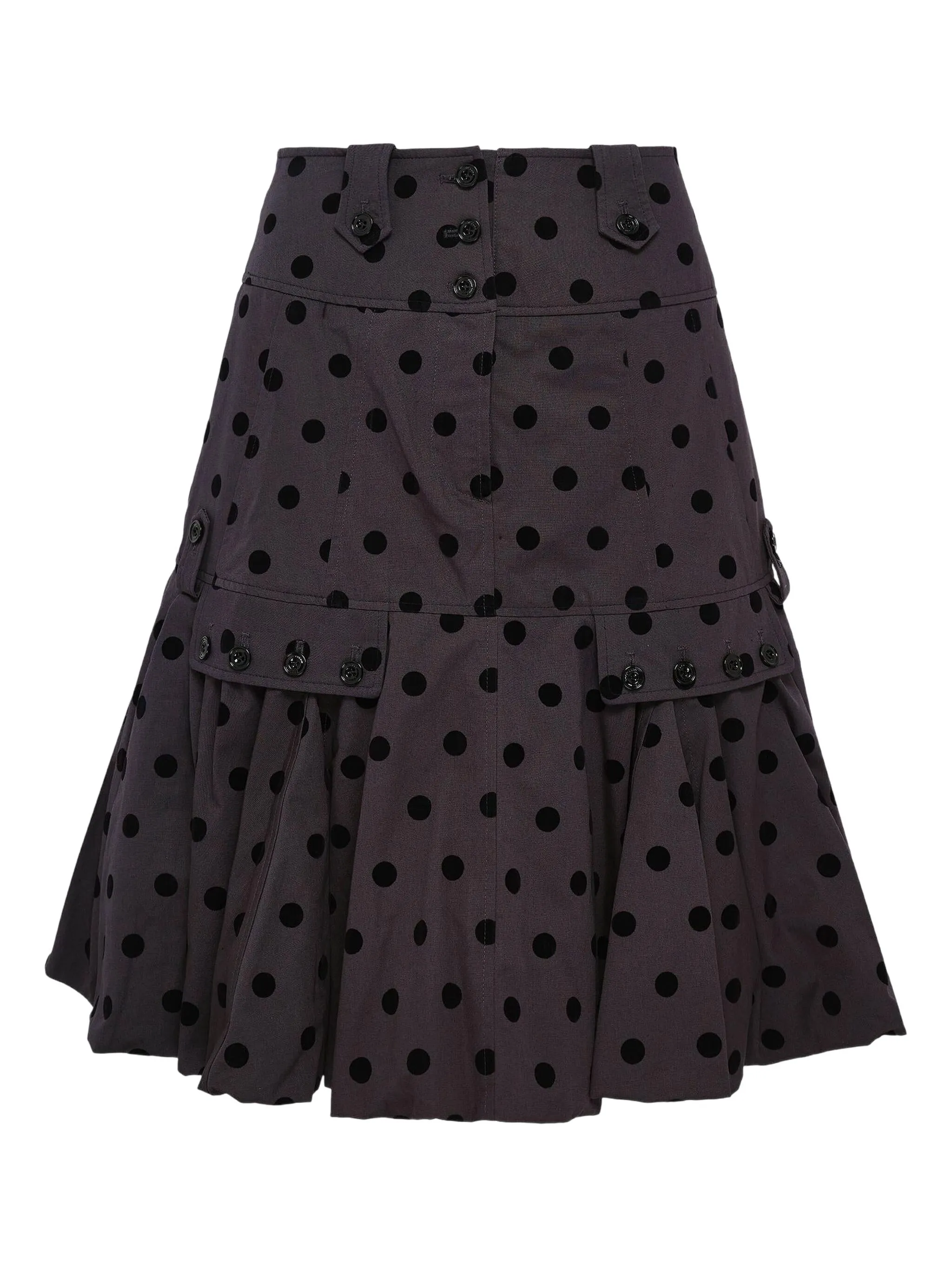 Серый узор в горошек, застежка на пуговицы, пышный низ, два задних кармана, шлевки для ремня