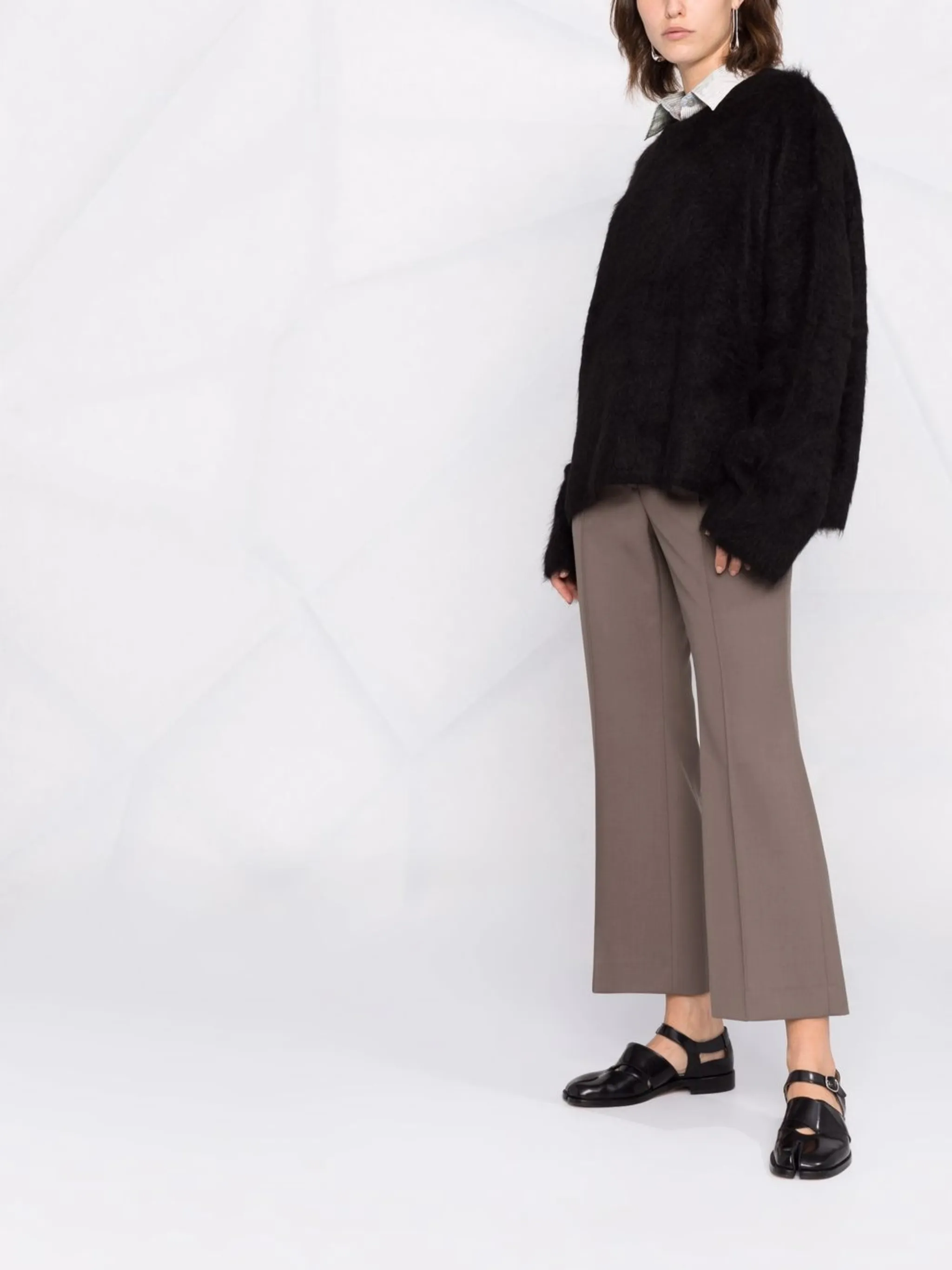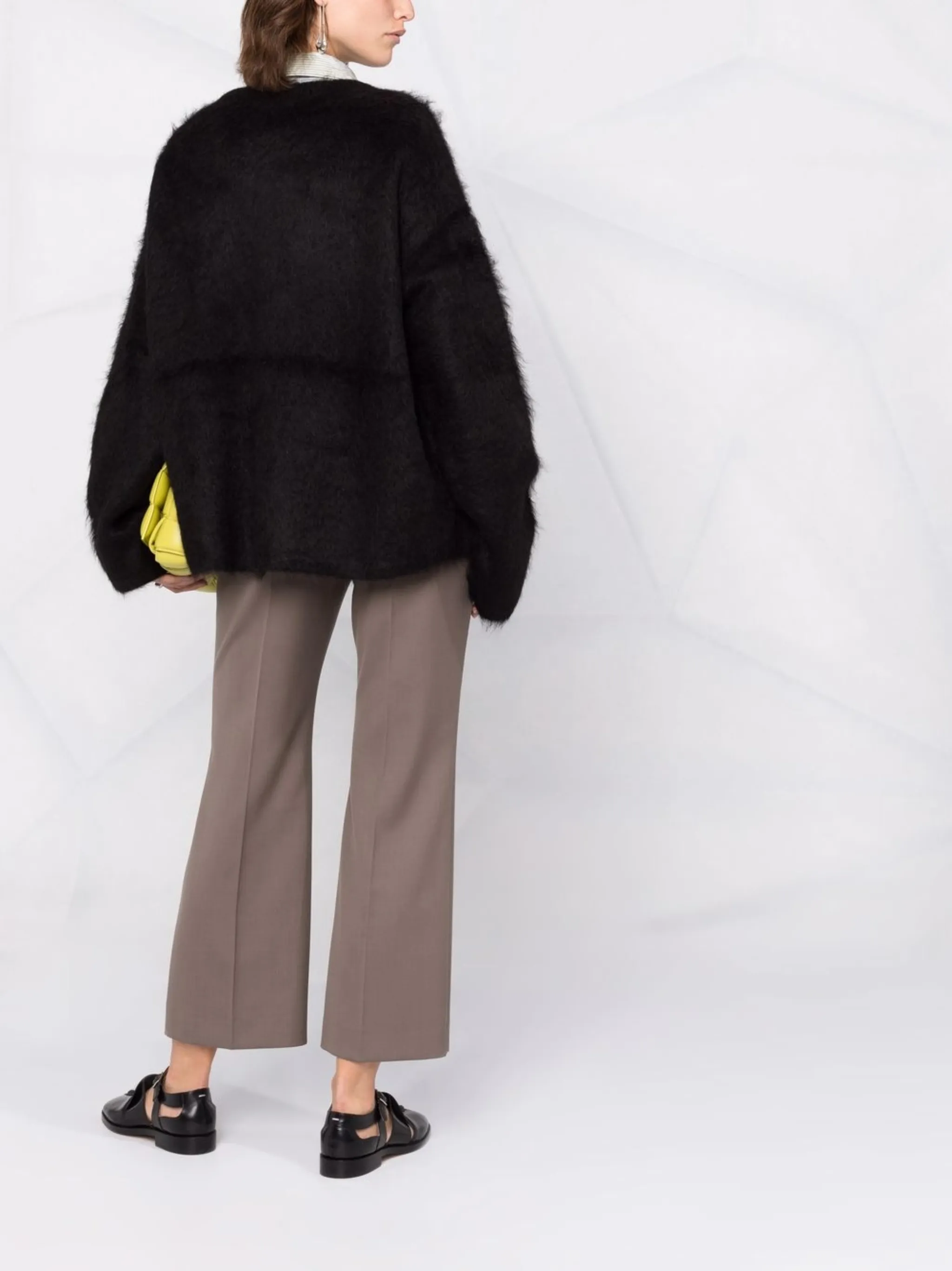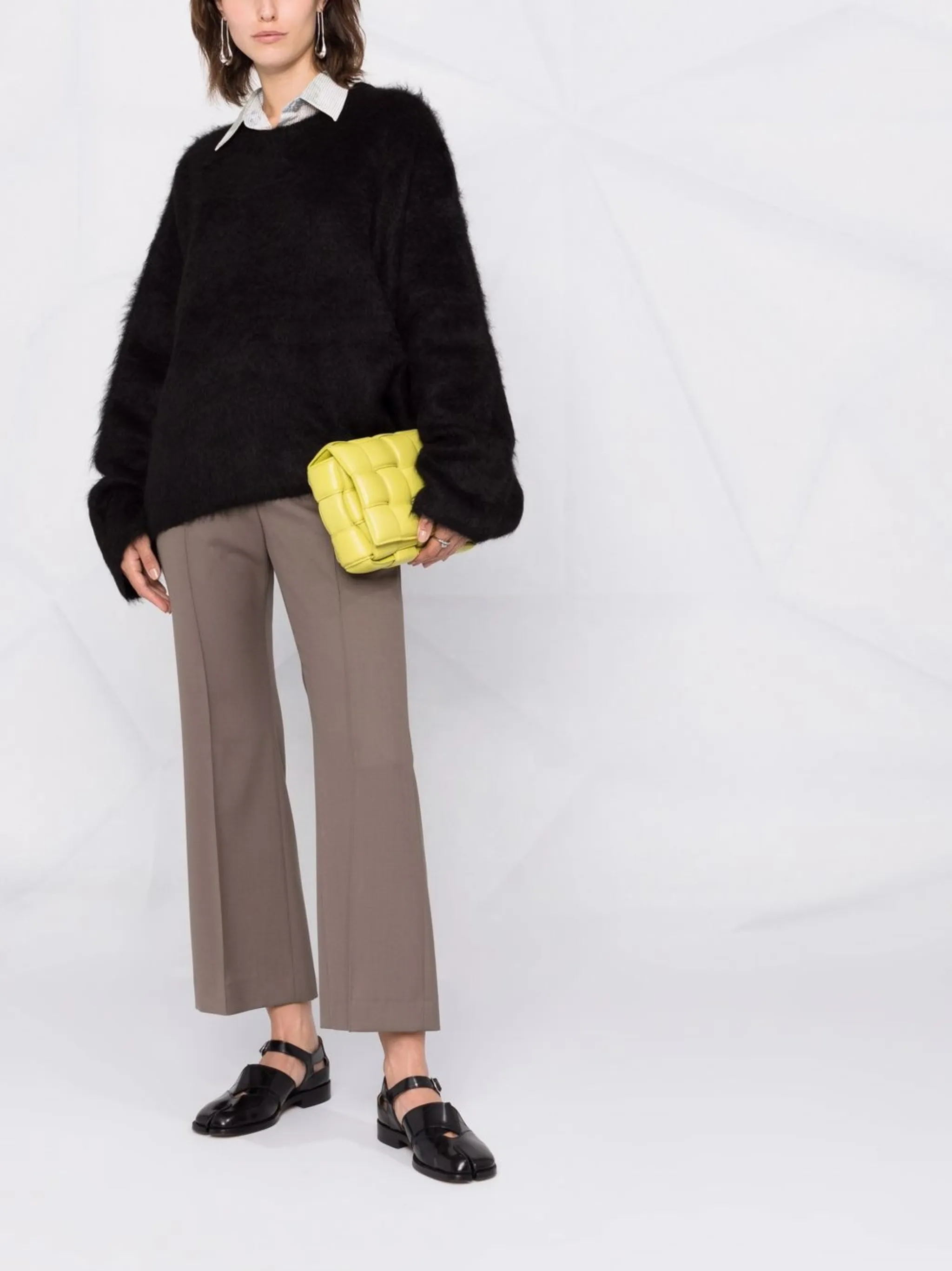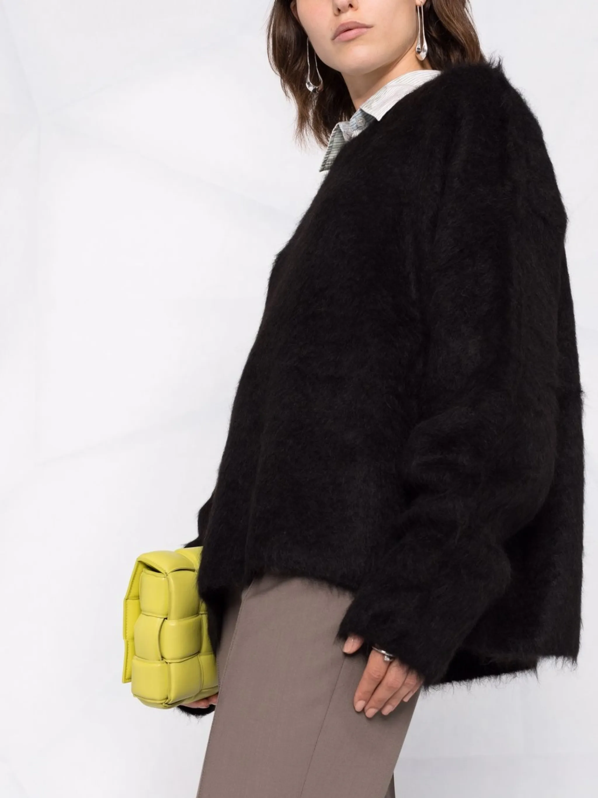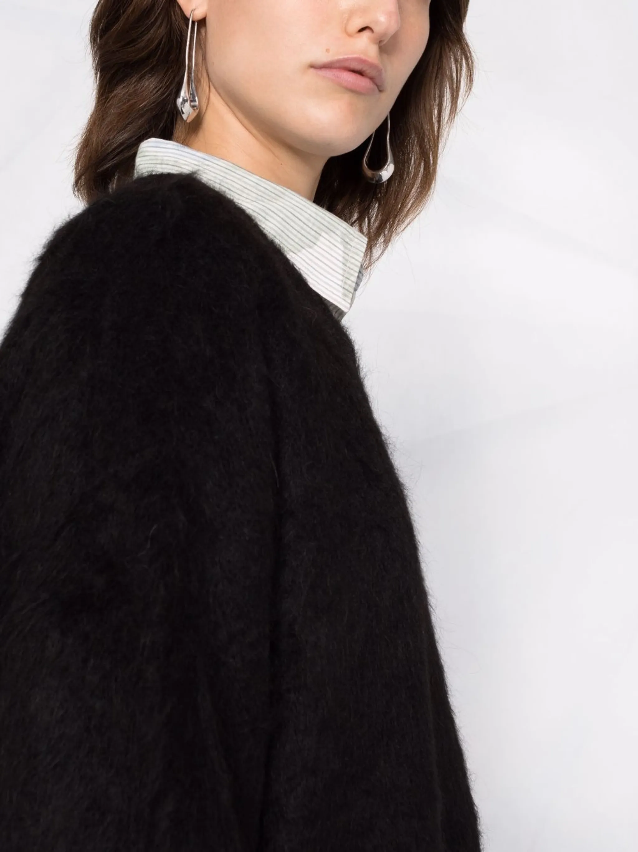 Круглый вырез, вязаные края в рубчик, прямой подол, приспущенные плечи и длинные рукава. Цвет: черный.