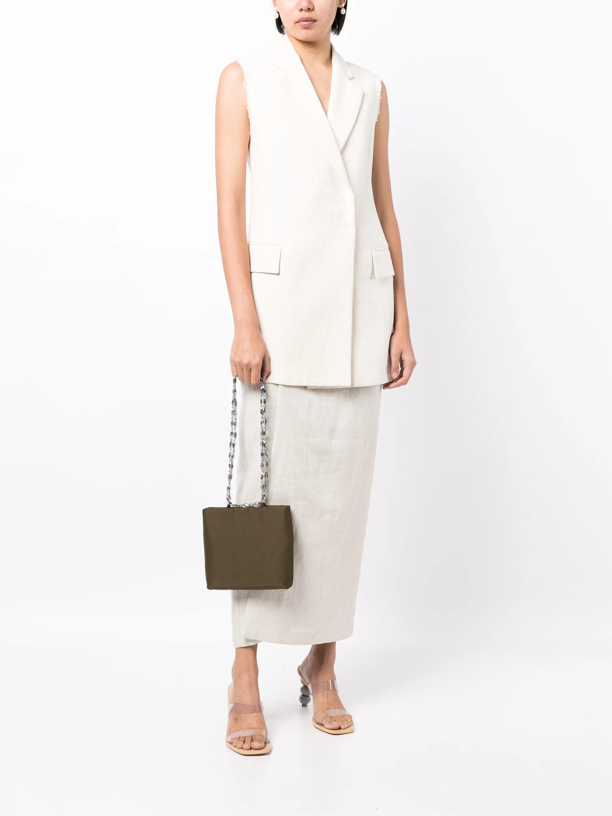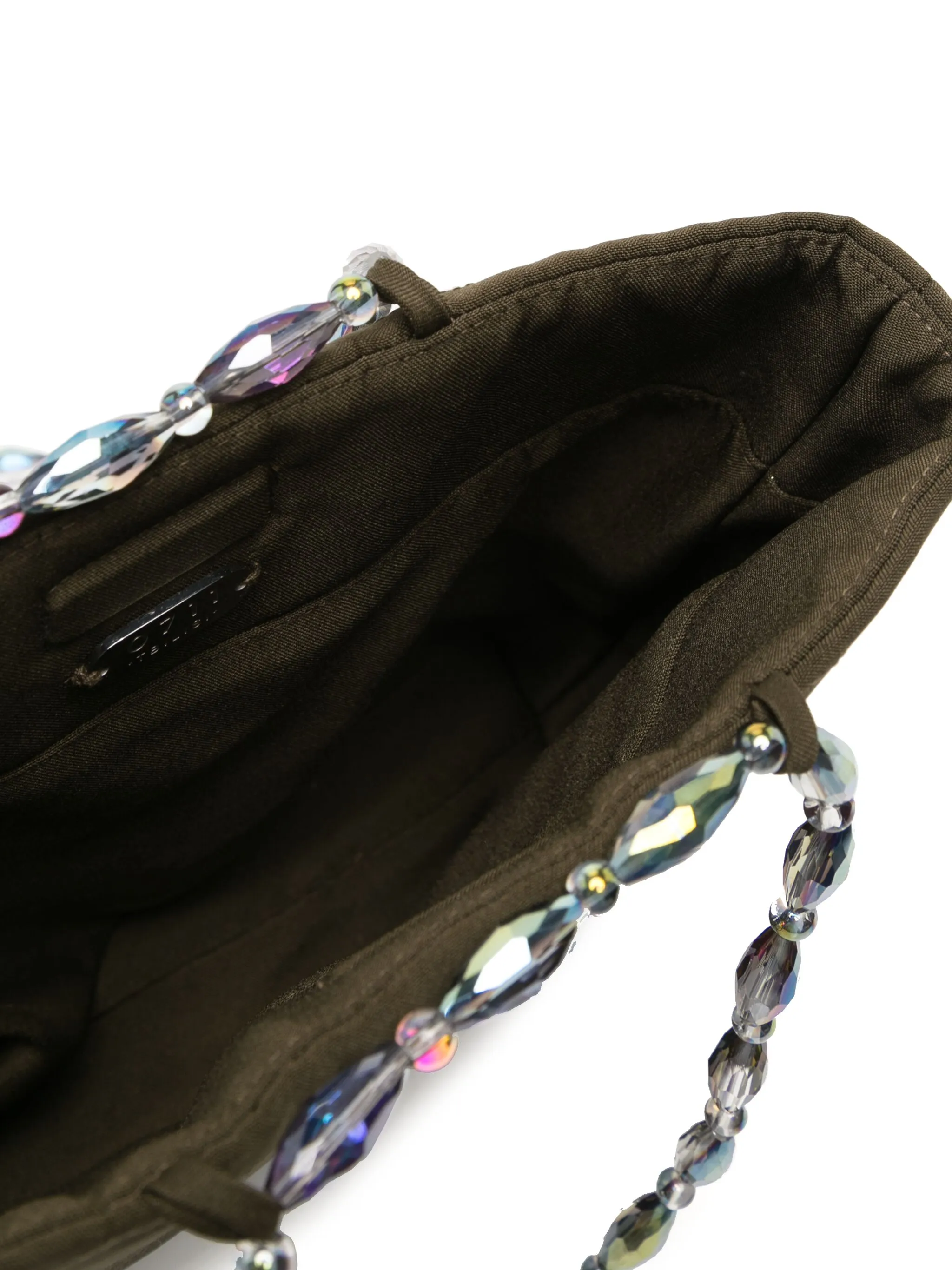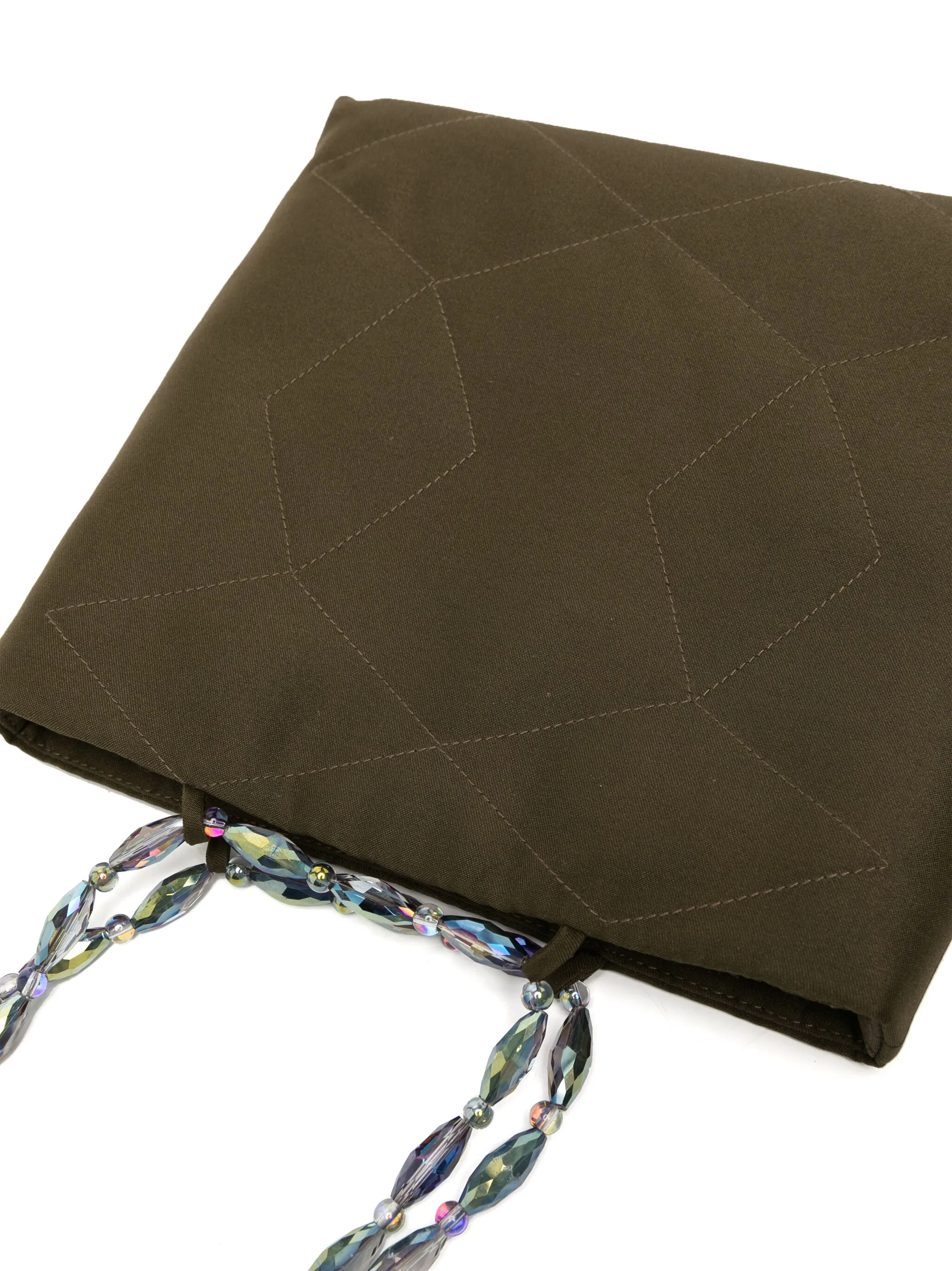 Стеганая модель, контрастная строчка, металлический логотип внутри, ручки с отделкой из бусин и потайная застежка на магните.