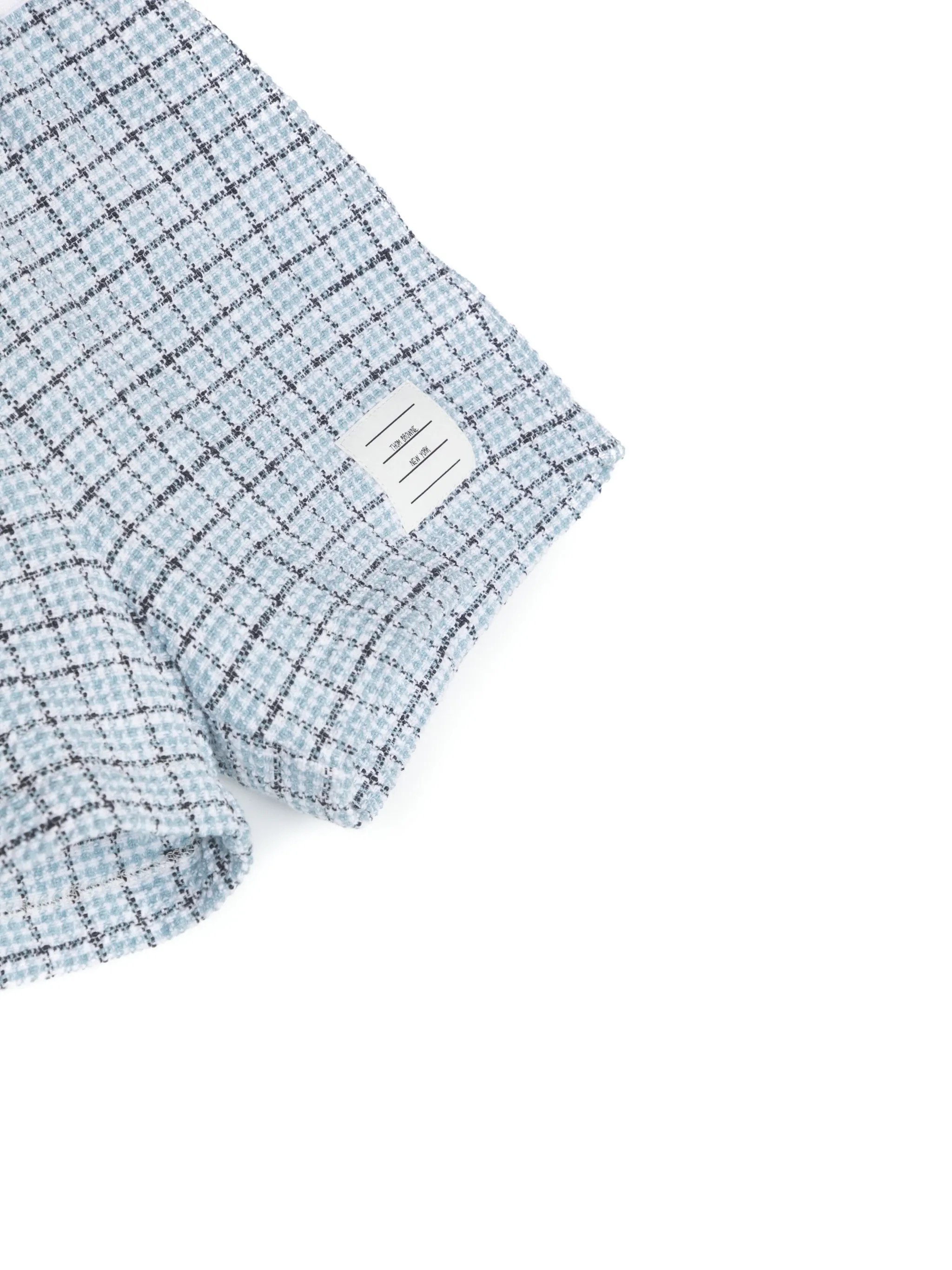 Голубой, молочно-белый, черный, эластичный хлопок, твидовая ткань, пояс с логотипом, нашивка с логотипом спереди, нашивка с логотипом сзади, эластичный пояс и прямой крой.