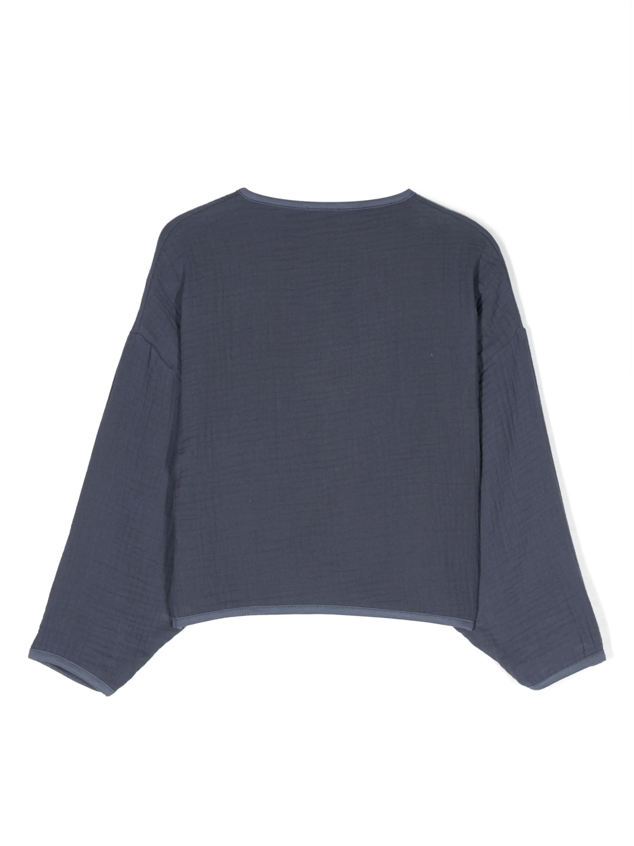 Темно-синий, хлопок, креповая текстура, V-образный вырез, застежка на пуговицах спереди, контрастная отделка, нашивка с логотипом внутри, длинные рукава и широкие рукава.